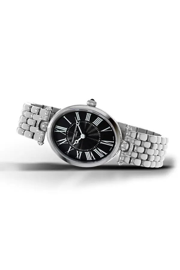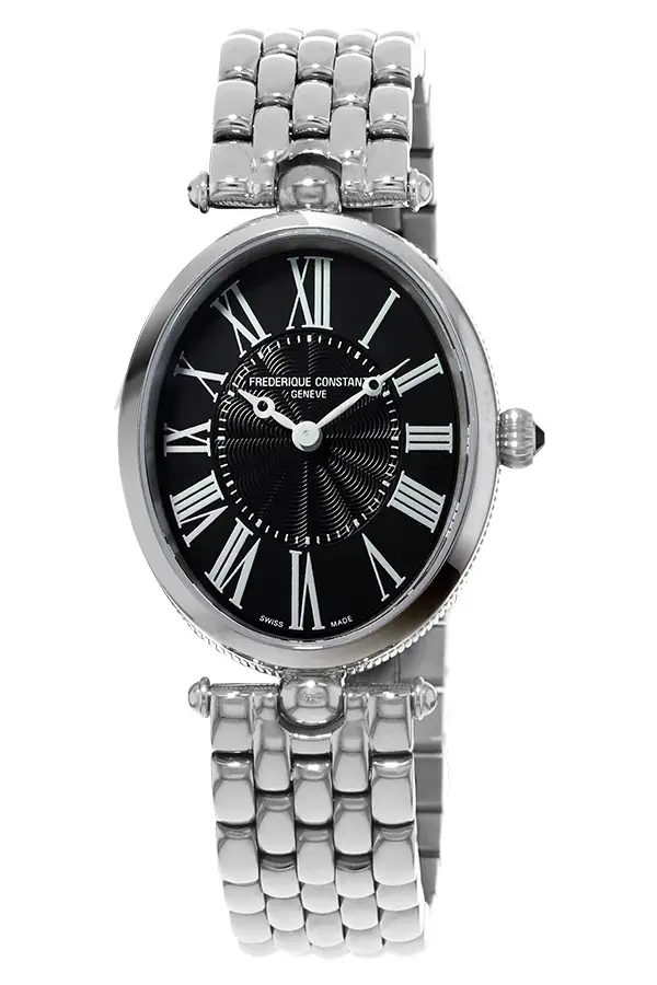 Frédérique Constant Classics Art Deco FC-200MPB2V6B jsou sofistikované dámské hodinky inspirované klasickou estetikou 20. let. Jejich oválné ocelové pouzdro o rozměrech 25 × 30 mm působí jemně a elegantně, zatímco černý analogový ciferník s římskými číslicemi dodává modelu nadčasový charakter. Dokonalou ochranu zajišťuje odolné safírové sklíčko, které chrání ciferník před poškrábáním.