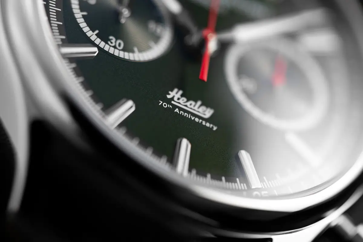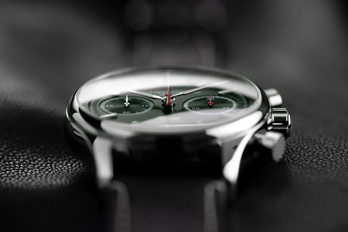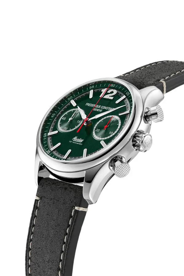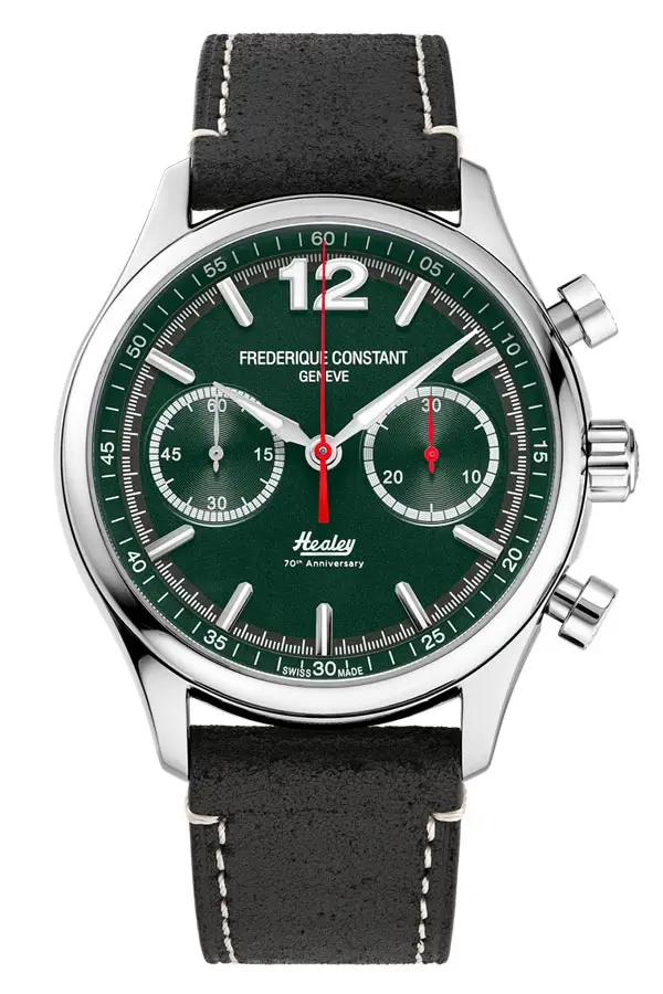 Frédérique Constant Vintage Rally Healey Chronograph je poctou britským závodním ikonám a ducha klasických automobilových soutěží. Tento sportovně elegantní model vyniká kulatým ocelovým pouzdrem o průměru 42 mm, které je doplněno výrazným zeleným číselníkem s kontrastními chronografovými subciferníky. Design evokuje přístrojové desky klasických vozů Austin-Healey, s nimiž je kolekce historicky spjata.
