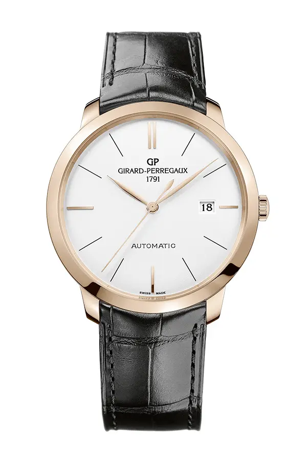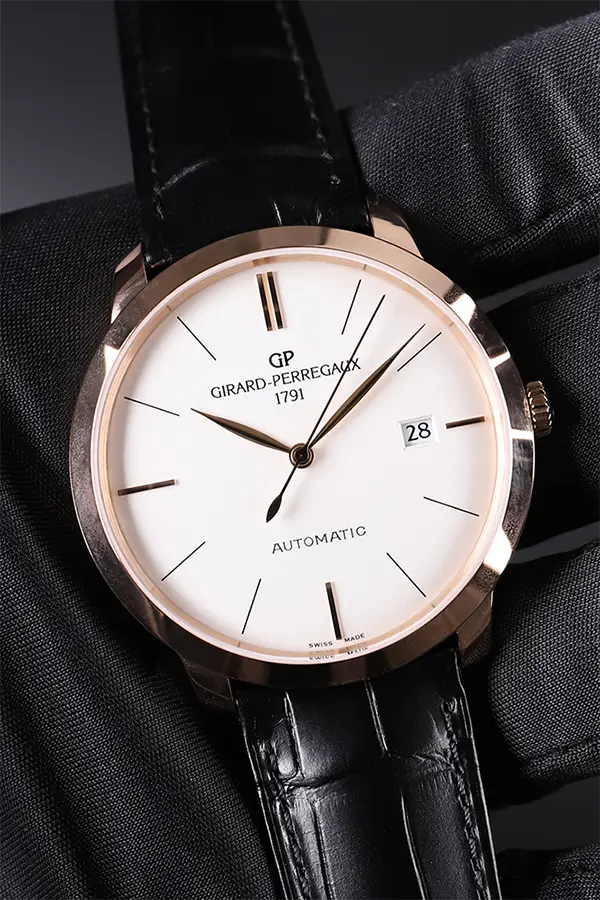 Design modelů je čistý a sofistikovaný – tenké kulaté pouzdro, jemně zakřivené safírové sklíčko, úzké indexy a elegantní ručky vytvářejí vyváženou a kultivovanou estetiku. V srdci hodinek tikají vlastní manufakturní strojky Girard-Perregaux, často s komplikacemi jako datum, fáze měsíce, nebo roční kalendář.