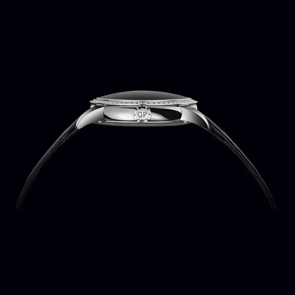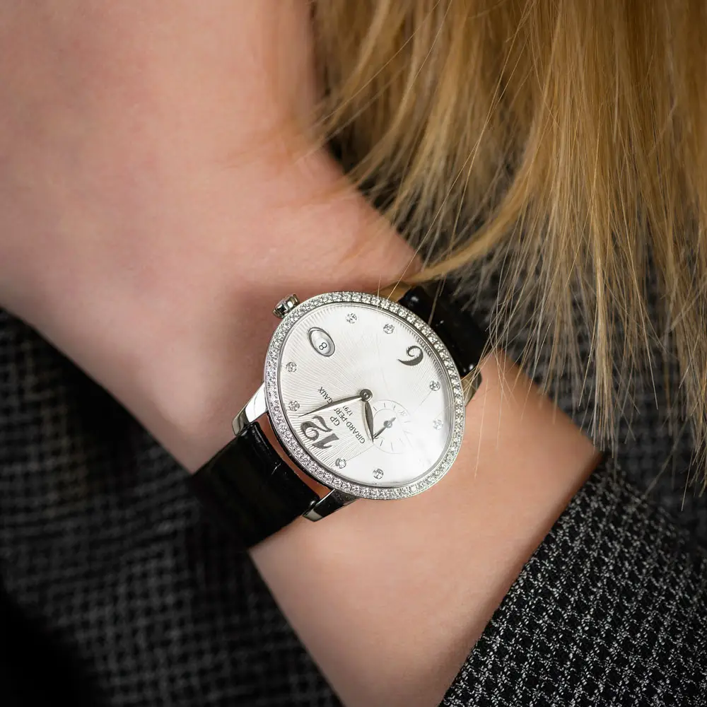 Hodinky Girard-Perregaux Cat’s Eye zaujmou svou ladnou elegancí a jemným ženským designem, který kombinuje luxusní materiály a precizní hodinářské zpracování. Jejich charakteristické oválné pouzdro o rozměrech 35,4 x 30,4 mm je vyrobeno z kvalitní oceli a chráněno odolným safírovým sklem, které zajišťuje dlouhou životnost a skvělou čitelnost.