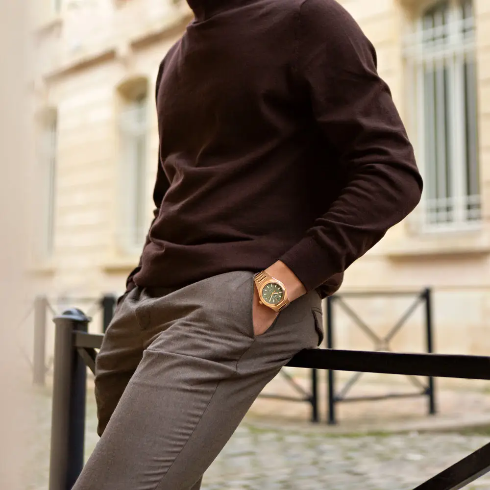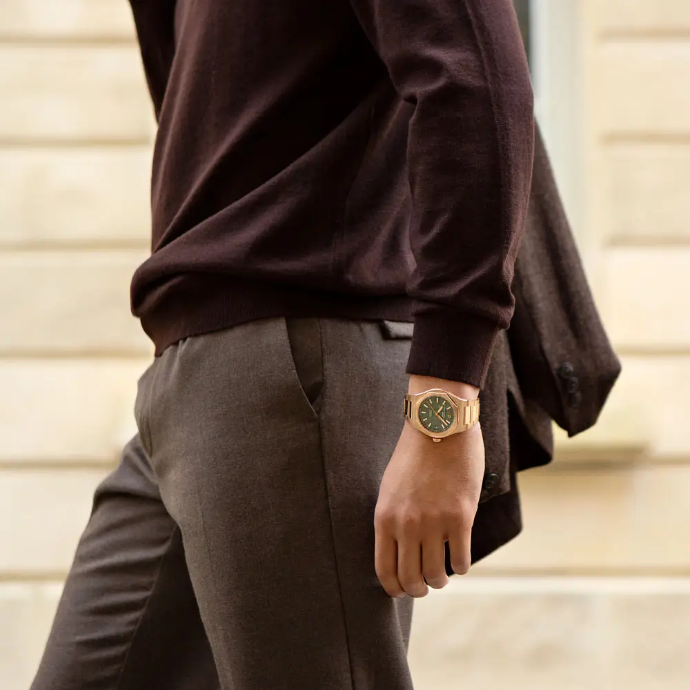 Pod odolným safírovým sklem se nachází výrazný zelený analogový ciferník, který přináší moderní a svěží nádech, doplněný praktickou datumovkou na tradiční pozici. V srdci hodinek pracuje precizní mechanický strojek s automatickým nátahem Caliber GP01800, který nabízí rezervu chodu přibližně 54 hodin, vysokou frekvenci 28 800 vph (4 Hz) a garantuje špičkovou přesnost a spolehlivost.