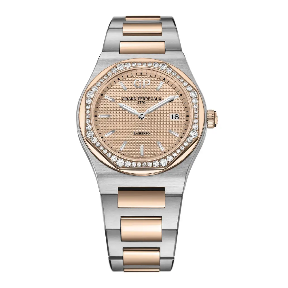 Výrazným prvkem tohoto modelu je luneta z 18karátového růžového zlata osazená diamanty, která dodává hodinkám exkluzivní a ženský šarm. Zlatý analogový ciferník vyniká svou jemností a přehledností, doplněnou o praktickou datumovku.