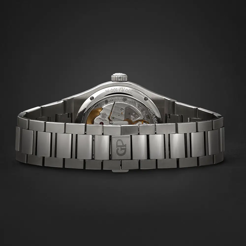 Hodinky Girard-Perregaux Laureato 42mm zaujmou čistým designem, který spojuje sportovní charakter a švýcarskou eleganci. Jejich kulaté pouzdro o průměru 42 mm je vyrobeno z odolné ušlechtilé oceli, stejně jako ocelová luneta a integrovaný stříbrný ocelový pásek zakončený komfortní překlápěcí sponou.