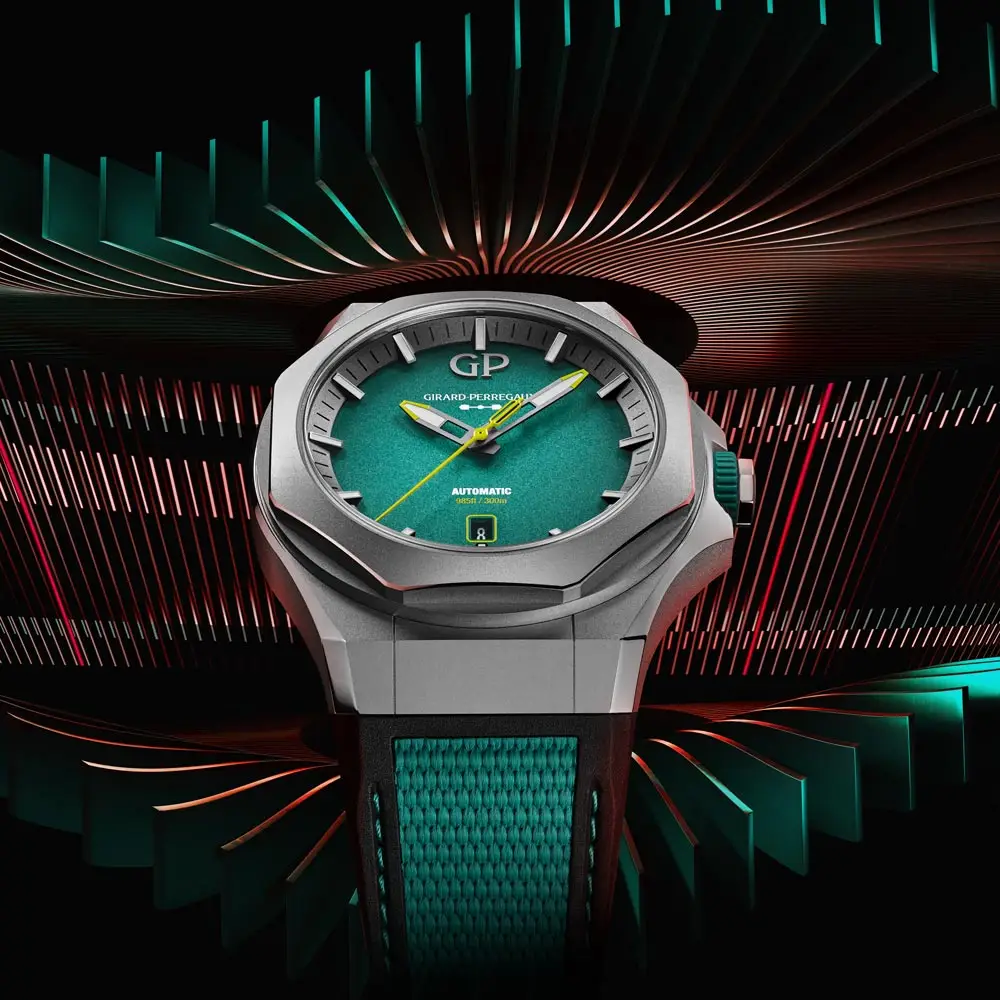 Uvnitř pracuje manufakturní kalibr GP03300-1060 s automatickým nátahem, frekvencí 28 800 vib/h a rezervou chodu 46 hodin. Model doplňuje zelený pryžový řemínek s textilní texturou a titanová spona s mikro-nastavením pro maximální komfort. Laureato Absolute Aston Martin F1® Edition je určen pro ty, kteří hledají spojení luxusu, výkonu a autentického závodního ducha.