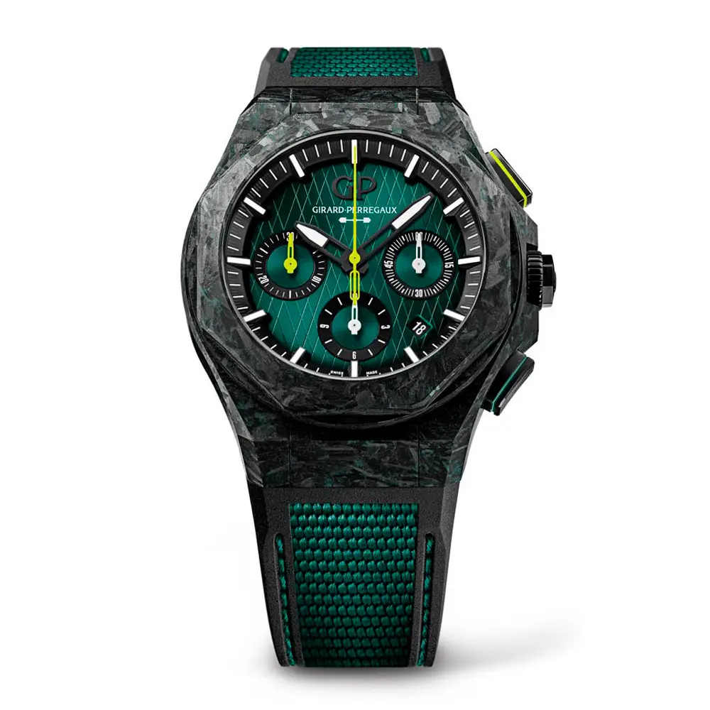 Hodinky Girard-Perregaux Laureato Absolute Chronograph Aston Martin F1 Edition spojují švýcarské hodinářské umění a svět Formule 1 v jedinečné limitované edici 306 kusů. Jejich 44mm pouzdro z titan-carbonu obsahuje karbonová vlákna ze skutečných monopostů Aston Martin F1 Team ze sezóny 2021, čímž podtrhuje technickou exkluzivitu a sportovní charakter modelu.