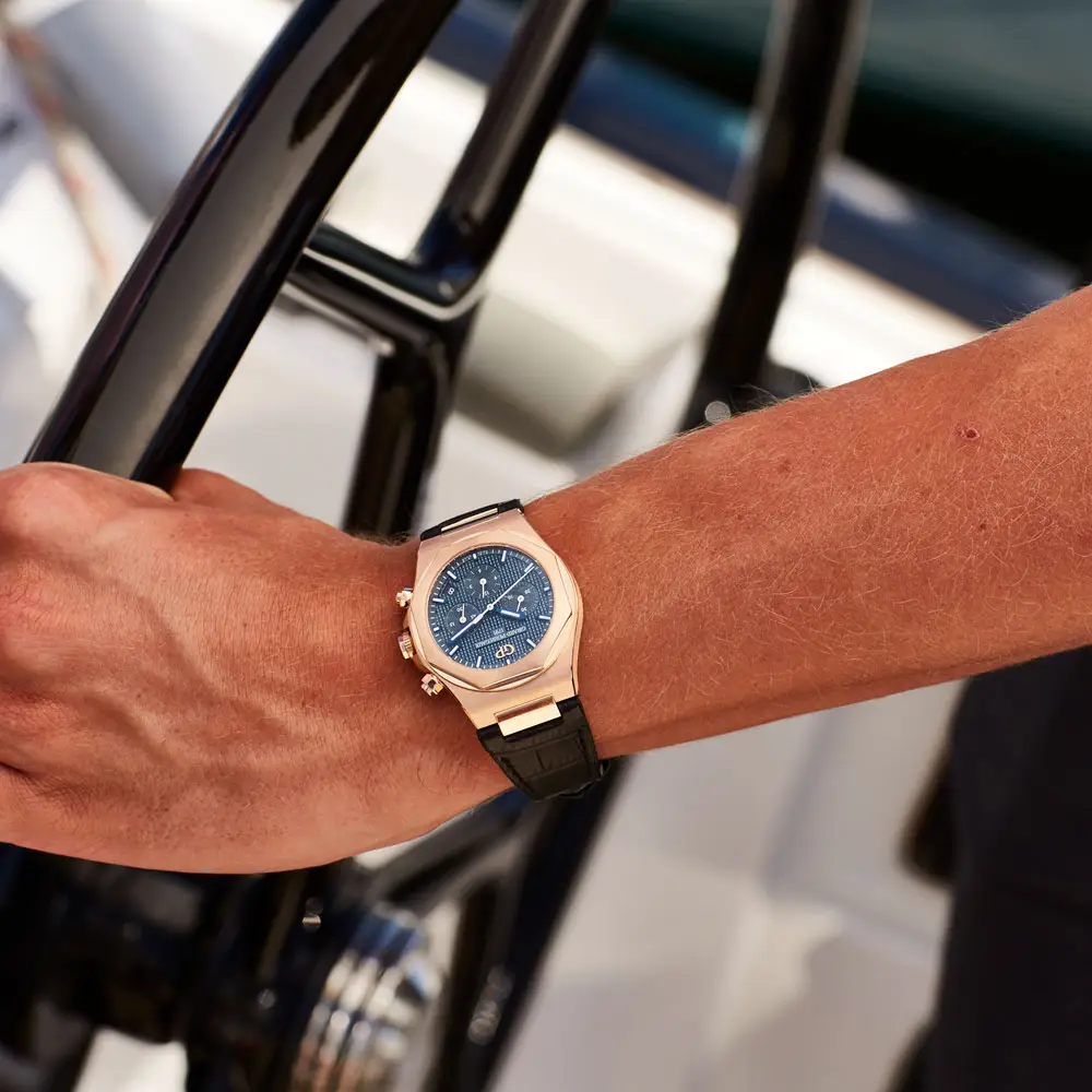Hodinky Girard-Perregaux Laureato Chronograph 42 mm zaujmou elegantní kombinací luxusního materiálu a sportovní funkčnosti. Jejich kulaté pouzdro o průměru 42 mm je vyrobeno z prestižního 18karátového růžového zlata, stejně jako sofistikovaná luneta, která dodává hodinkám výjimečný a vytříbený vzhled.