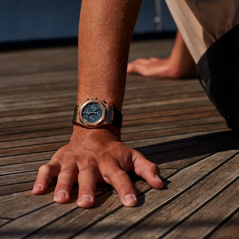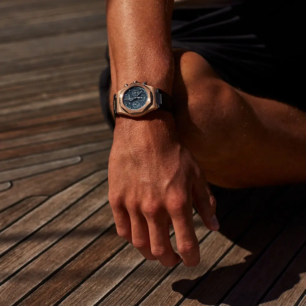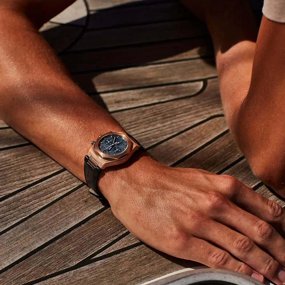 Dynamický a zároveň elegantní design doplňuje modrý řemínek z aligátoří kůže zakončený komfortní překlápěcí sponou, která garantuje bezpečné a pohodlné nošení. Díky vodotěsnosti 5 ATM (50 metrů) jsou hodinky vhodné pro každodenní použití, včetně lehkého kontaktu s vodou.