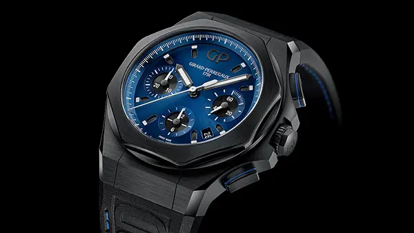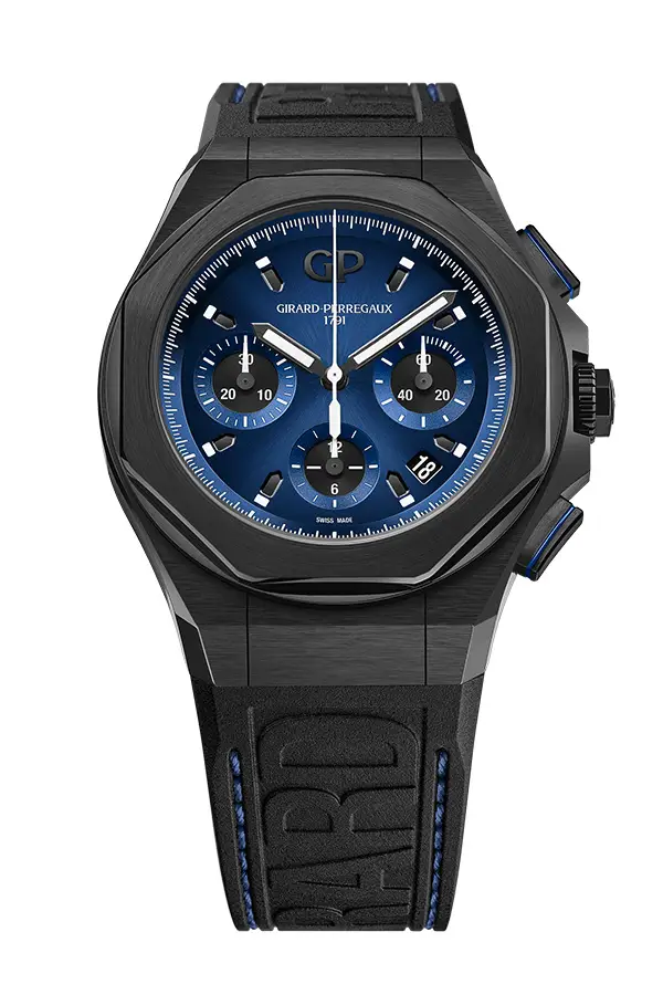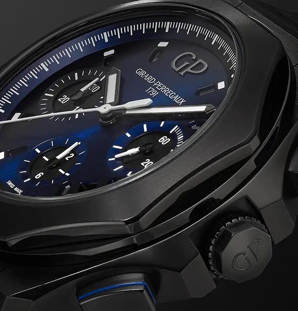 Hodinky Girard-Perregaux Laureato Chronograph 81060 jsou sportovním modelem, který spojuje odvážný design, špičkové materiály a precizní švýcarské zpracování. Kulaté pouzdro o průměru 44 mm je vyrobeno z lehkého a odolného titanu, který zajišťuje komfortní nošení i při větším rozměru, a doplňuje jej elegantní titanová luneta.