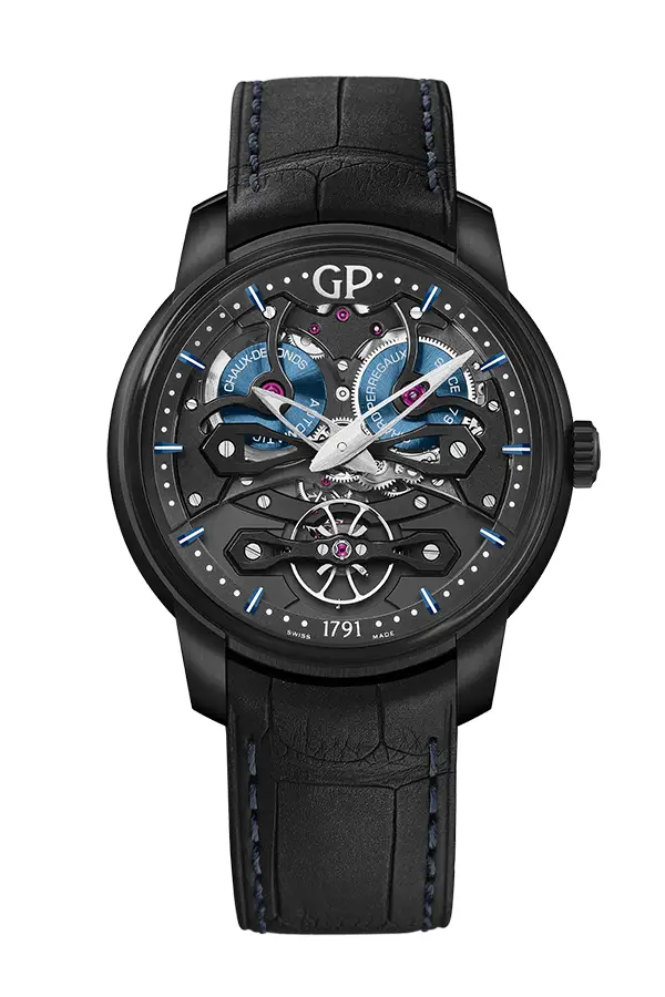 Girard-Perregaux mistrně pracuje s luxusními materiály a spolehlivě zaujme všemi svými modely. V modelové řadě Bridges Earth to Sky představuje esenci sportovní elegance. Prostor černého ciferníku plně přejímá strojek hodinek, který jako by nechával nahlédnout do hlubin času. Základ v černé, která provází i titanové pouzdro a kaučukový pásek, působí mimořádně atraktivně. Hodinky precizně řídí mechanika s automatickým nátahem.
