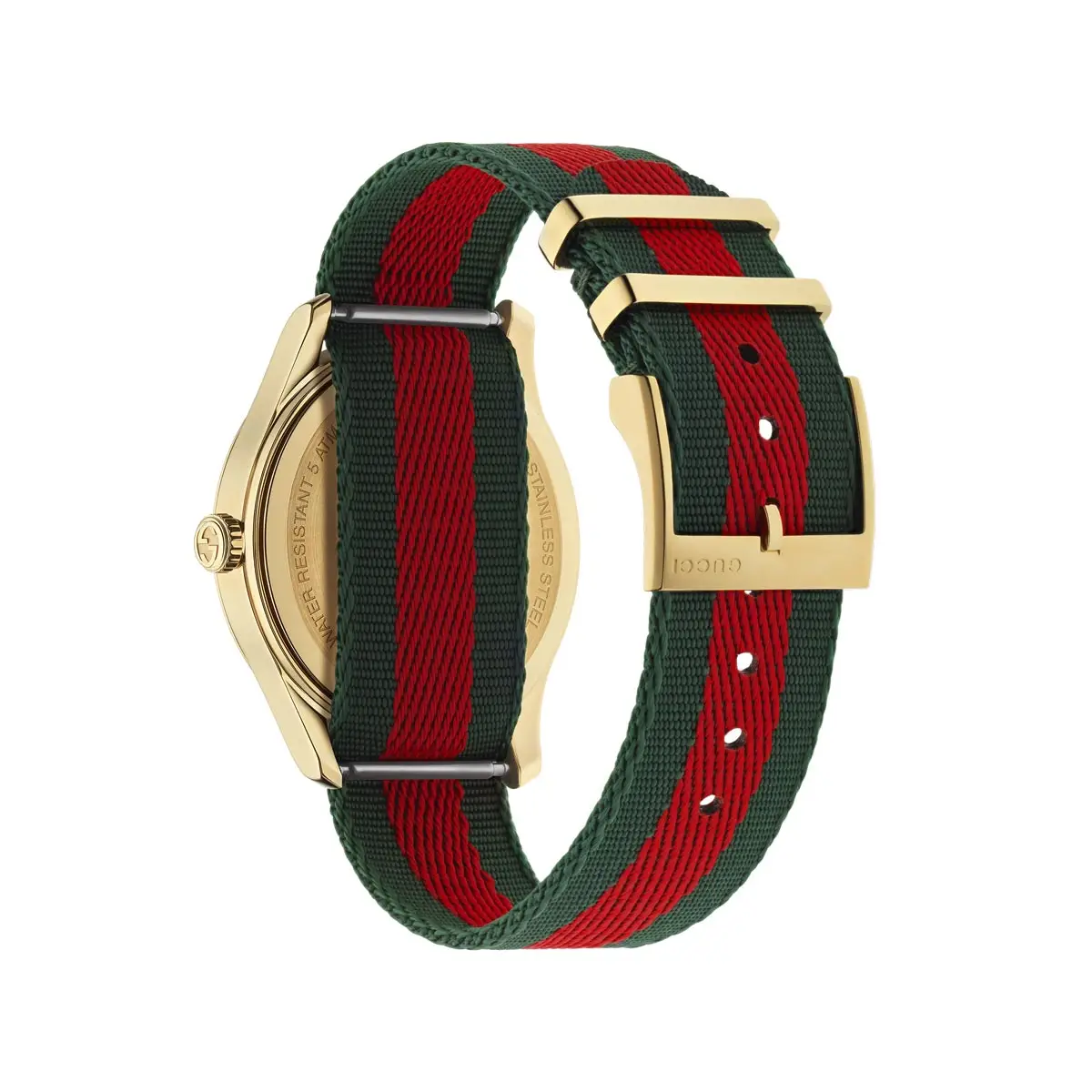 Gucci G-Timeless Contemporary YA126487B je výrazný model, který propojuje moderní estetiku s ikonickými detaily značky. Na ruce zaujme kulaté pouzdro 38 mm z oceli / žlutého zlacení s lunetou z oceli / žlutého zlacení, chráněné safírovým sklem. Design dotváří bicolor analogový ciferník a pohodlný textilní pásek bicolor s trnovou sponou, díky čemuž hodinky působí svěže a stylově od rána do večera.