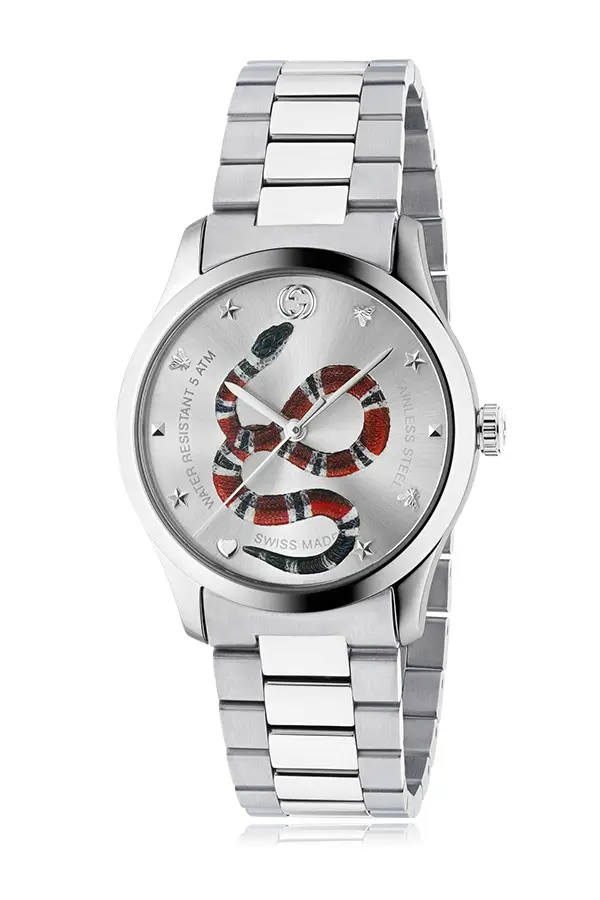 Gucci G-Timeless YA1264076 je elegantní model, který propojuje moderní estetiku s ikonickým rukopisem značky. Na ruce zaujme kulaté pouzdro 38 mm z oceli, chráněné safírovým sklem a doplněné čistou ocelovou lunetou. Jednotný, uhlazený vzhled podtrhuje ocelový pásek ve stříbrné barvě s překlápěcí sponou, zatímco bicolor analogový ciferník dodává celku svěží, nadčasový akcent.