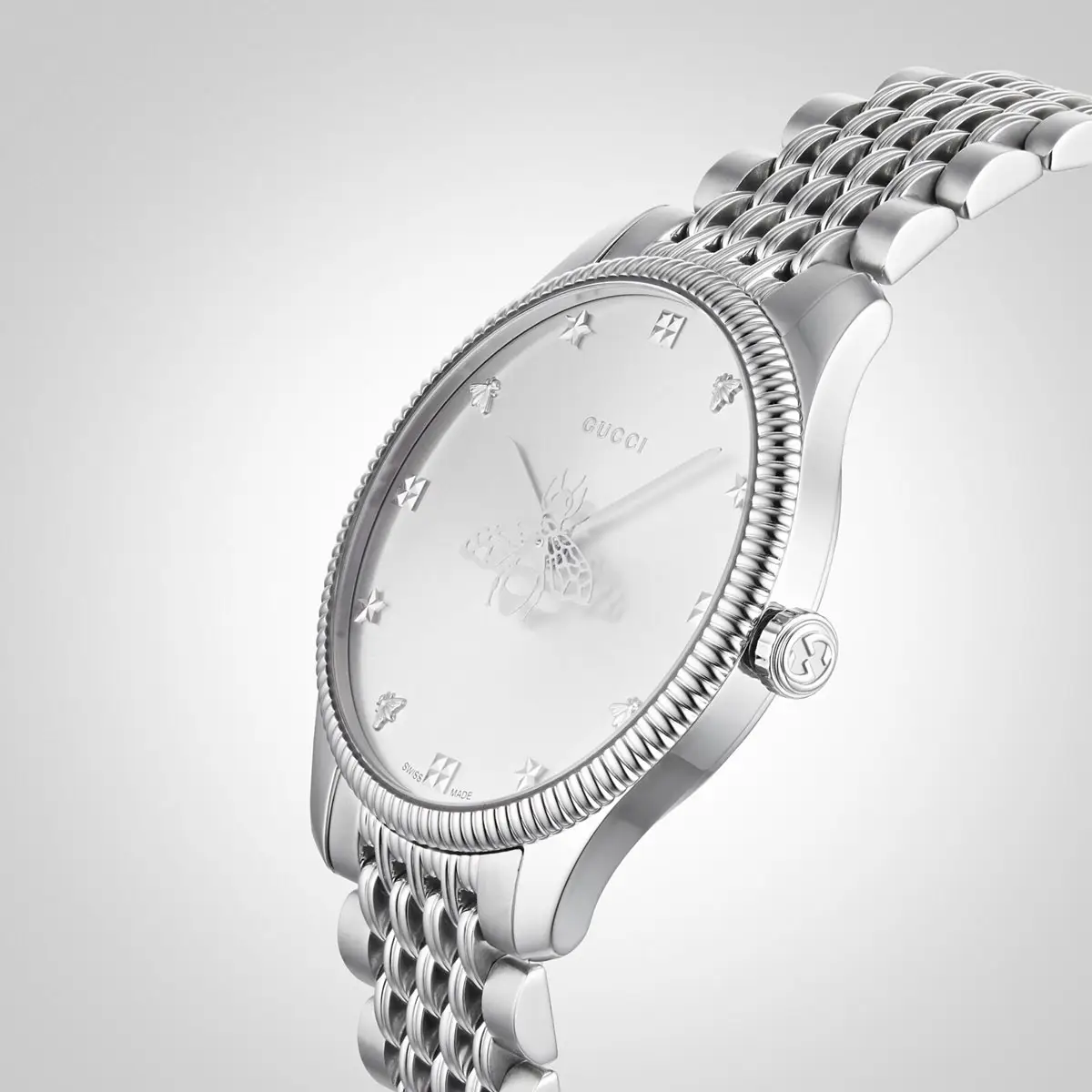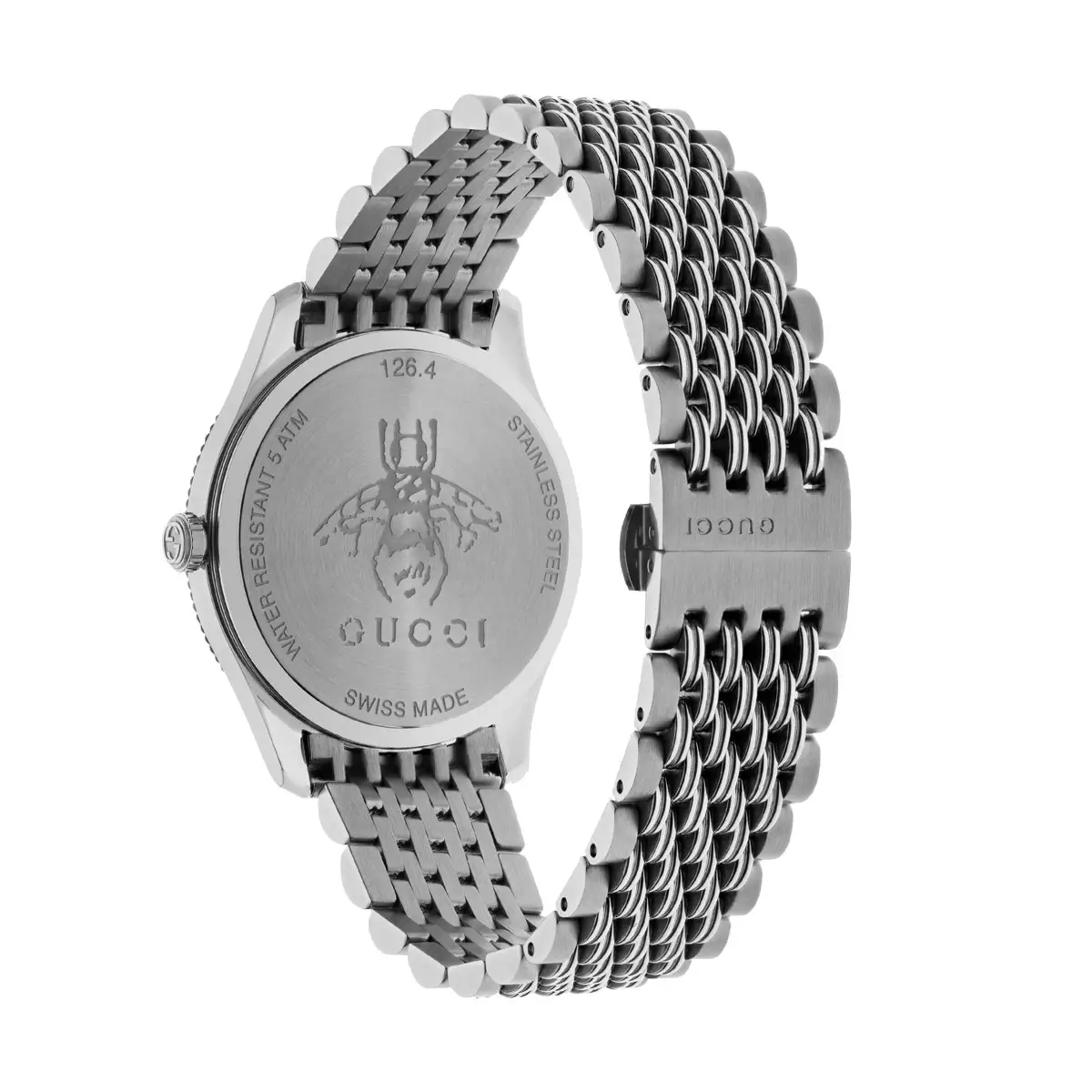 Gucci G-Timeless YA1264153 je elegantní model, který spojuje čistý design s ikonickým rukopisem značky. Na ruce zaujme kulaté pouzdro 36 mm z oceli, chráněné safírovým sklem a doplněné čistou ocelovou lunetou. Uhlazený dojem podtrhuje stříbrný analogový ciferník a jednotný vzhled ocelového pásku ve stříbrné barvě s překlápěcí sponou – nadčasová kombinace pro každý den.