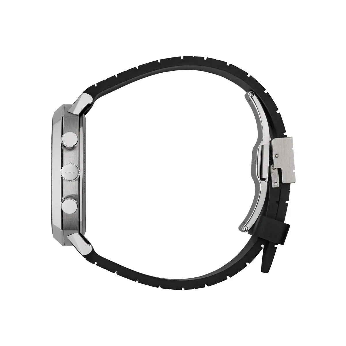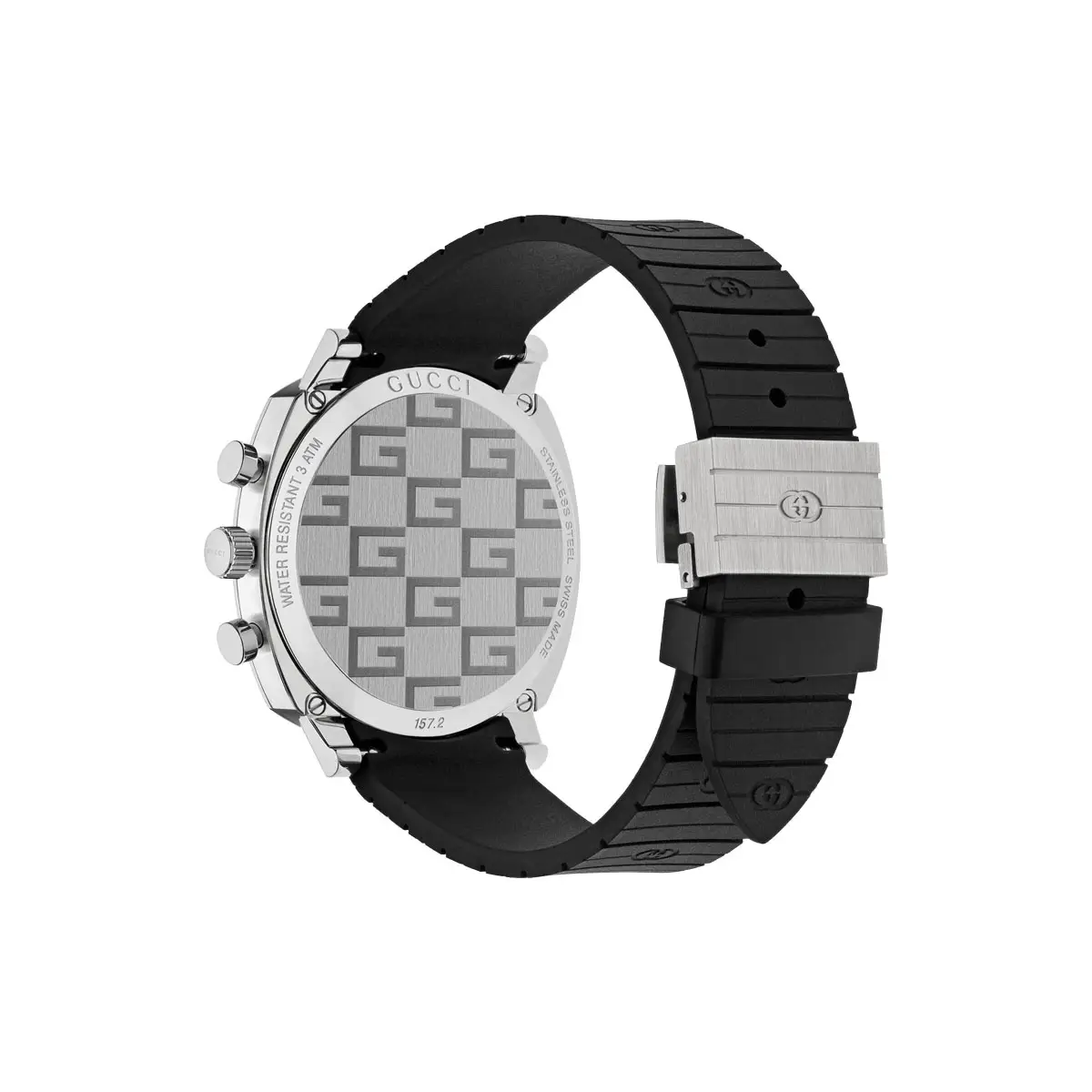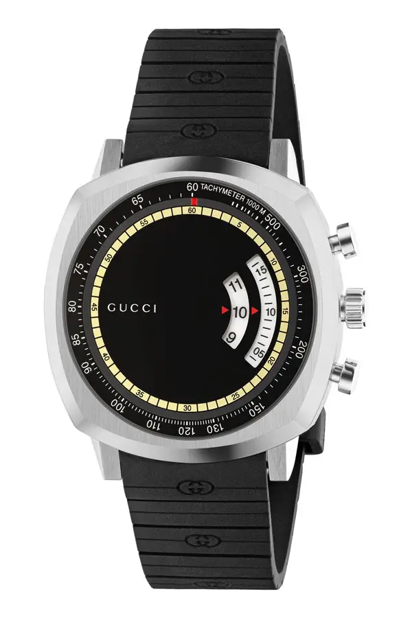 Gucci Grip Chronograph YA157301 je výrazný model, který propojuje futuristický design řady Grip se sportovní funkčností. Zaujme hranatým pouzdrem 40 mm z oceli, chráněným safírovým sklem, a čistou ocelovou lunetou. Uhlazený, technický výraz podtrhuje černý analogový ciferník s kontrastními subciferníky a pohodlný kaučukový pásek v černé barvě s překlápěcí sponou. Pro běžný kontakt s vodou nechybí vodotěsnost 3 ATM / 30 m.