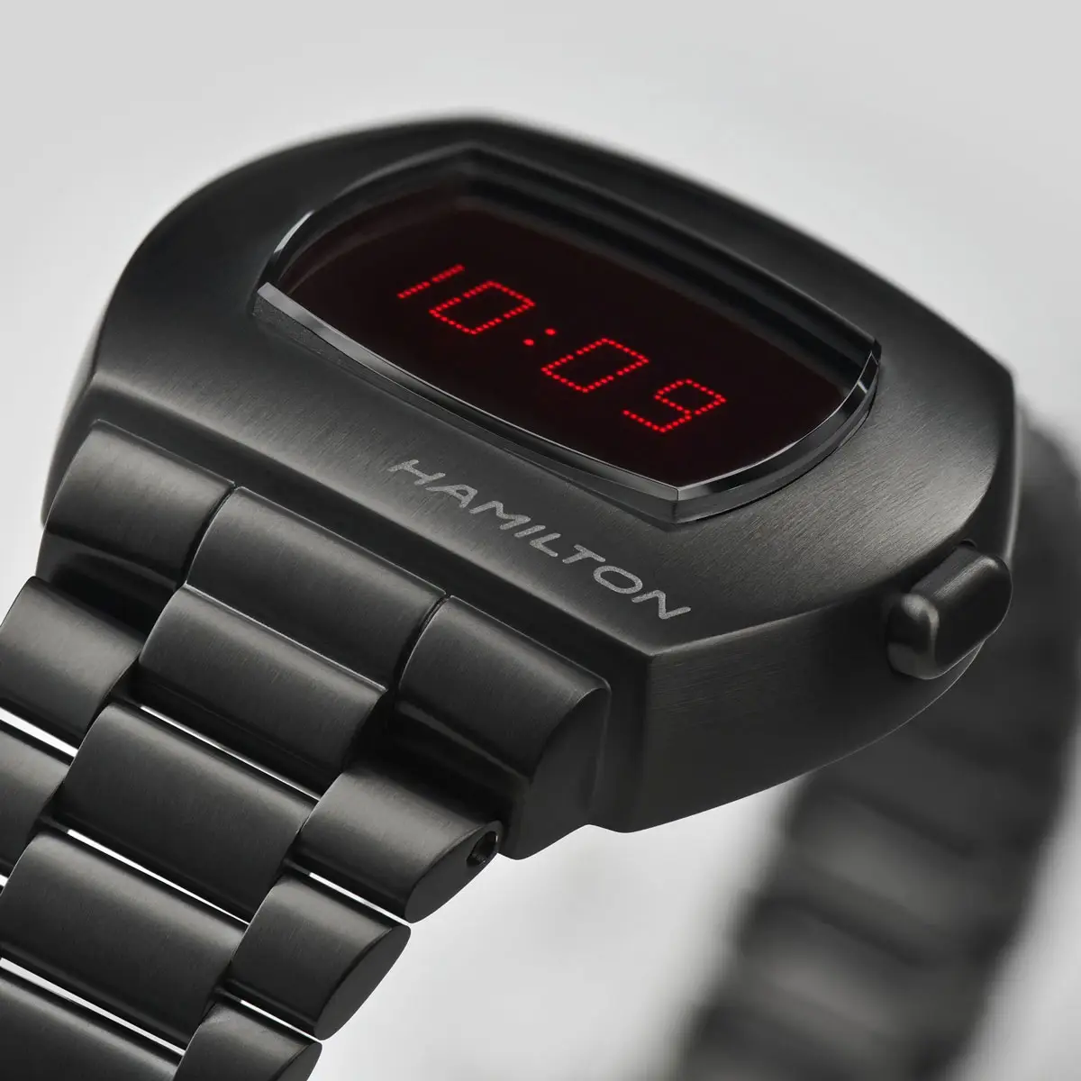 Hamilton American Classic PSR Digital Quartz H52404130 jsou ikonické digitální hodinky, které vzdávají hold revolučnímu designu z 70. let. Jejich hranaté pouzdro o rozměrech 40,8 × 34,7 mm v kombinaci s černou PVD úpravou oceli působí futuristicky, ale zároveň nadčasově elegantně.