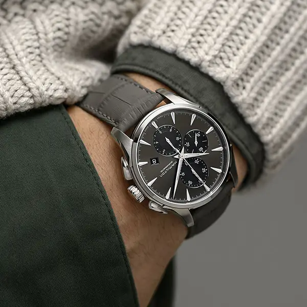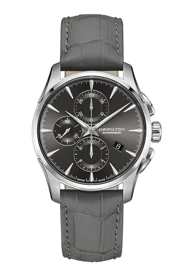 Klasicky zpracované hodinky Jazzmaster Auto Chrono H32586881 značky Hamilton zaujmou netradičním koženým páskem v šedé barvě s perfektně sladěnou barvou ciferníku. Na sametově černém podkladu si své místo našel chronograf, ale také datumovka. Ciferník chrání safírové sklo. Hodinky jsou vodotěsné, takže s nimi můžete bez obav i do bazénu.
