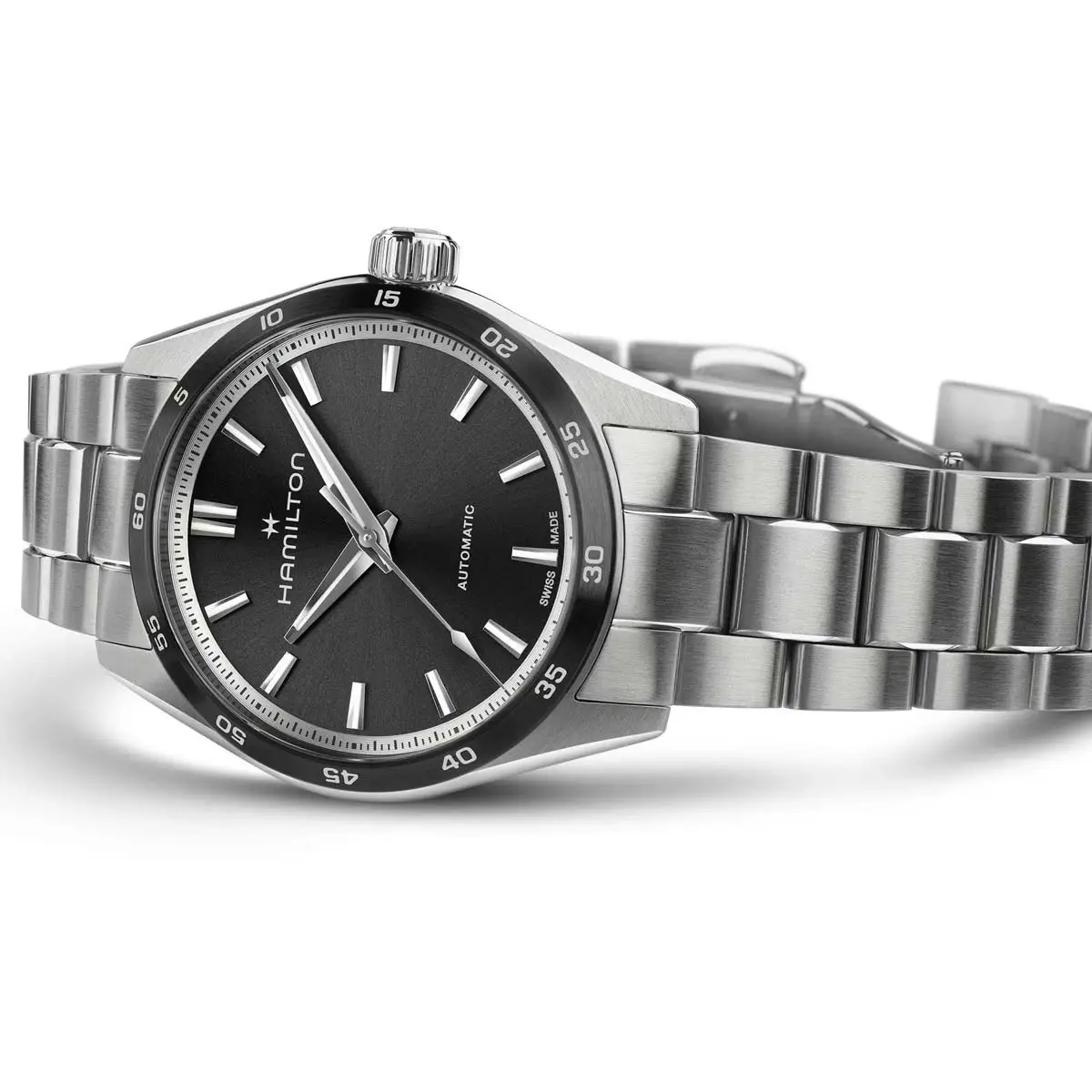 Černý analogový ciferník je elegantní a přehledný, bez zbytečných rušivých prvků, a je orámován stylovou lunetou z oceli a hliníku, která dodává hodinkám sportovní nádech. Uvnitř se ukrývá spolehlivý mechanický strojek H-10 s automatickým nátahem, který se může pochlubit rezervou chodu až 80 hodin, což zajišťuje dlouhou výdrž i při nepravidelném nošení.
