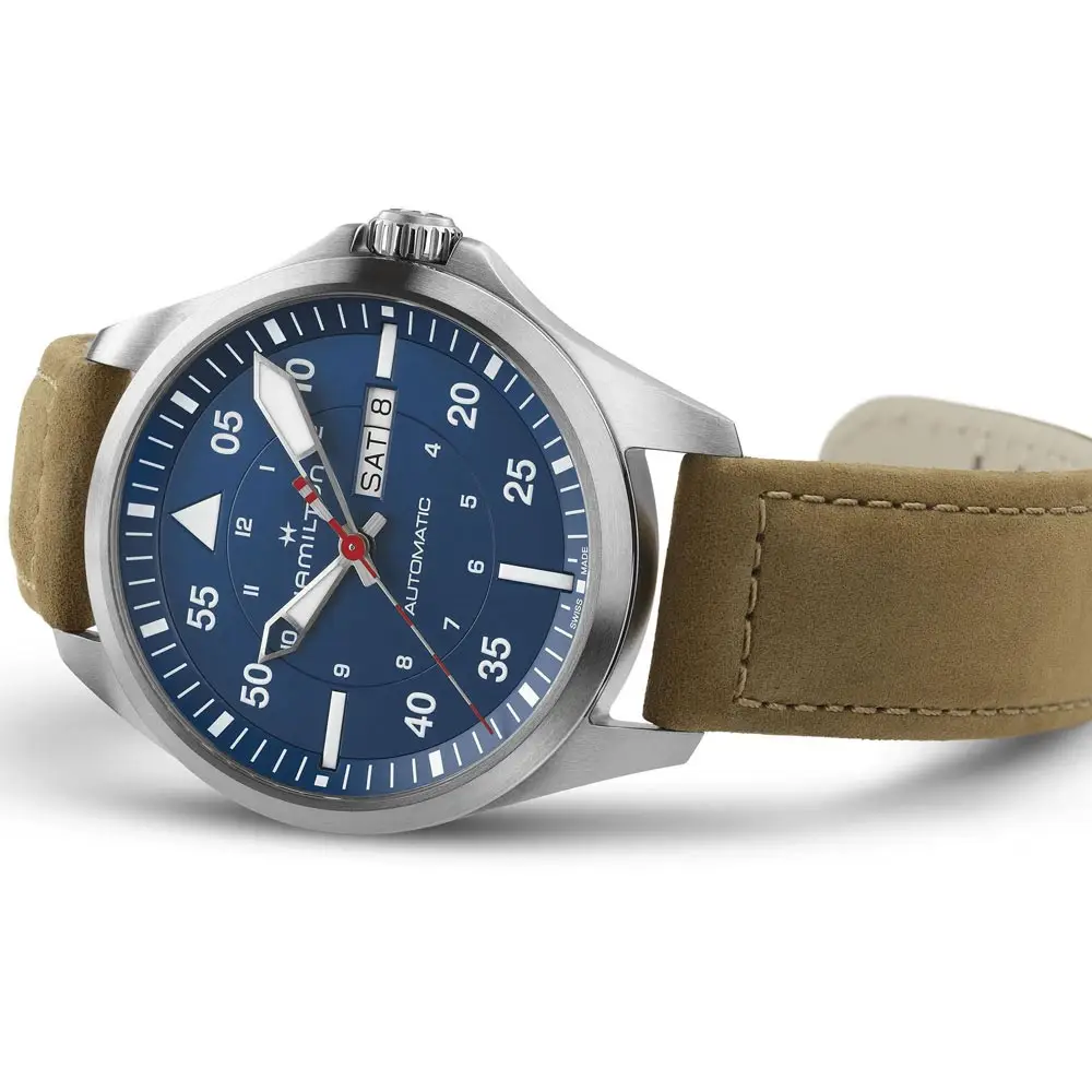 Modrý analogový ciferník s výraznými číslicemi a luminiscenčními ručkami nabízí nejen skvělou přehlednost, ale i funkci zobrazení dne v týdnu a data, což ocení každý pilot či dobrodruh. Uvnitř pracuje robustní mechanický strojek Caliber H-30 s automatickým nátahem a působivou rezervou chodu až 80 hodin, která zaručuje dlouhodobou výdrž i bez každodenního nošení.
