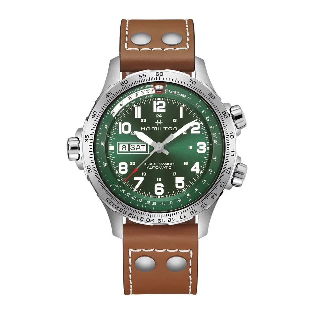 Pánské hodinky Hamilton Khaki Aviation X-Wind Day Date Auto H77735560 představují profesionální pilotní nástroj navržený pro maximální přesnost a funkčnost v náročných podmínkách. Pouzdro z nerezové oceli o průměru 45 mm doplňuje safírové sklíčko s antireflexní úpravou, které zajišťuje vysokou odolnost a perfektní čitelnost. Výrazný zelený ciferník ve stylu leteckých přístrojů s arabskými číslicemi, luminiscencí a vnitřní otočnou lunetou podtrhuje technický charakter modelu.