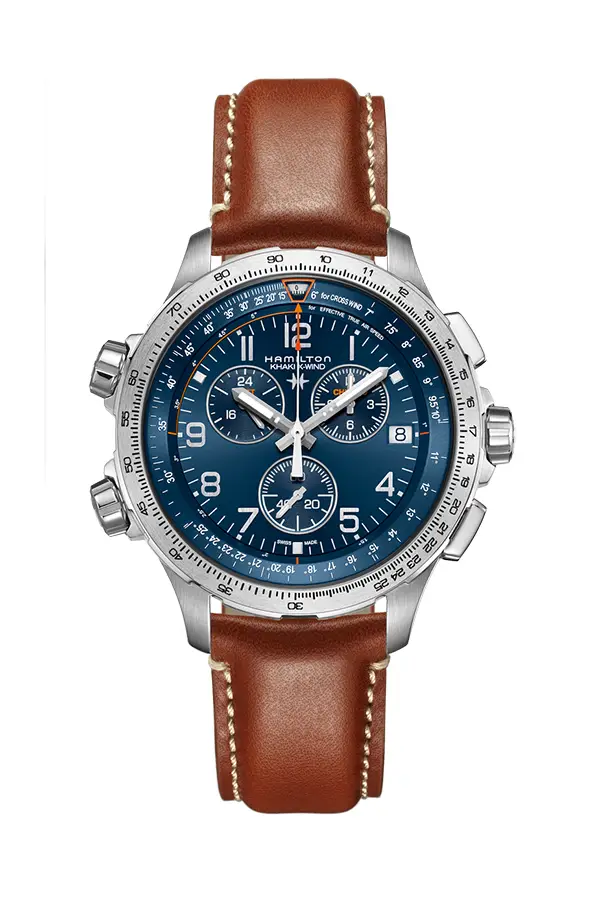 Pánské letecké hodinky Khaki Aviation X-Wind GMT Chrono Quartz H77922541 značky Hamilton ukazují nejen čas, ale také datum, údaje spojené s chronografem a kolísání spojené s nárazy větru. Hodinky zaujmou svoji robustností, která je výsledkem kombinace masivního 46mm pouzdra z oceli a mohutného pásku z hnědé kůže. Všechny sportovní muže potěší, že s hodinkami mohou i plavat.