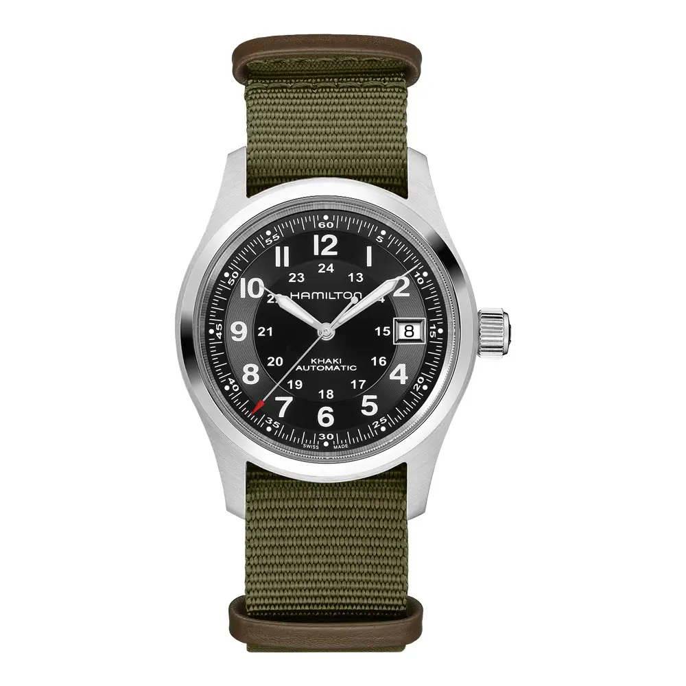 Typickým znakem Khaki Field hodinek je čistý číselník s výraznými arabskými číslicemi, 24hodinovou stupnicí a luminiscenčními ručkami. Nabízejí se v různých velikostech a provedeních – od mechanických modelů s ručním nátahem, přes automatické verze, až po quartzové varianty. Pouzdra jsou často z oceli s matnou úpravou, doplněná textilními, koženými nebo ocelovými náramky, odolnými proti každodennímu opotřebení.
