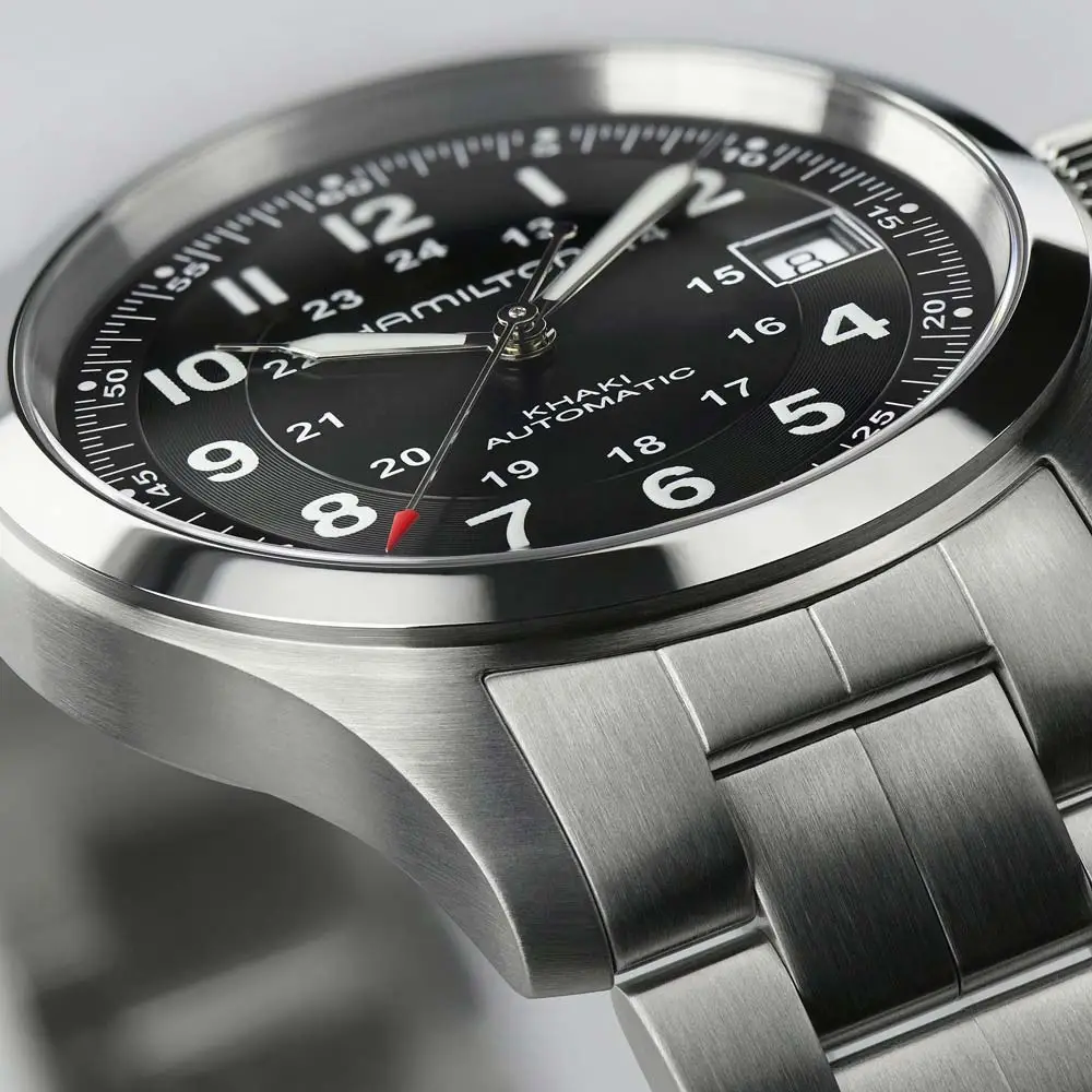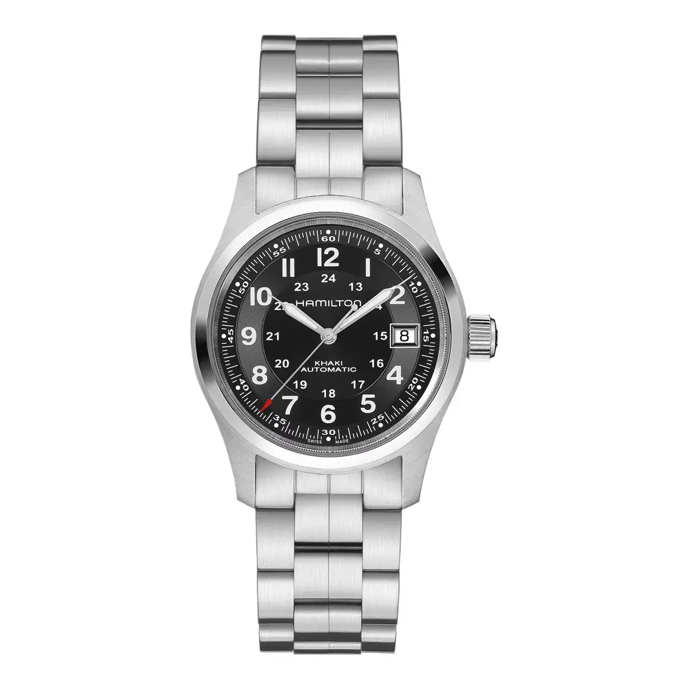 Typickým znakem Khaki Field hodinek je čistý číselník s výraznými arabskými číslicemi, 24hodinovou stupnicí a luminiscenčními ručkami. Nabízejí se v různých velikostech a provedeních – od mechanických modelů s ručním nátahem, přes automatické verze, až po quartzové varianty. Pouzdra jsou často z oceli s matnou úpravou, doplněná textilními, koženými nebo ocelovými náramky, odolnými proti každodennímu opotřebení.