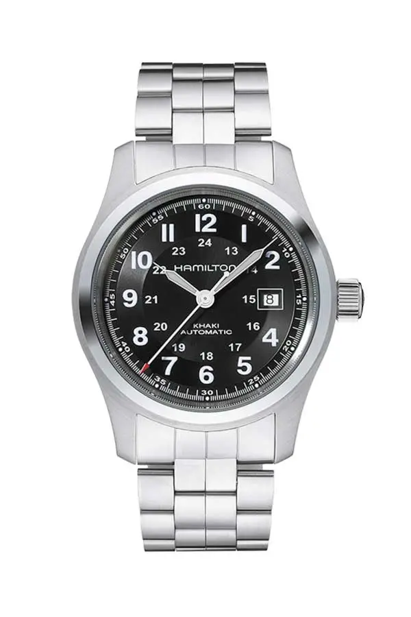 Typickým znakem Khaki Field hodinek je čistý číselník s výraznými arabskými číslicemi, 24hodinovou stupnicí a luminiscenčními ručkami. Nabízejí se v různých velikostech a provedeních – od mechanických modelů s ručním nátahem, přes automatické verze, až po quartzové varianty. Pouzdra jsou často z oceli s matnou úpravou, doplněná textilními, koženými nebo ocelovými náramky, odolnými proti každodennímu opotřebení.