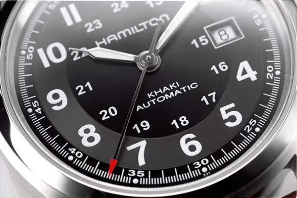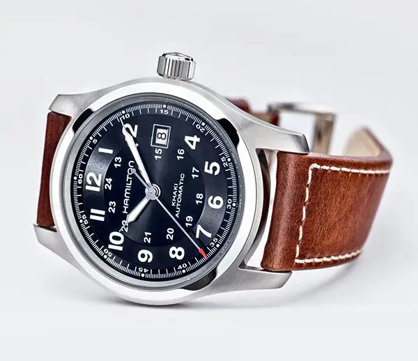 Typickým znakem Khaki Field hodinek je čistý číselník s výraznými arabskými číslicemi, 24hodinovou stupnicí a luminiscenčními ručkami. Nabízejí se v různých velikostech a provedeních – od mechanických modelů s ručním nátahem, přes automatické verze, až po quartzové varianty. Pouzdra jsou často z oceli s matnou úpravou, doplněná textilními, koženými nebo ocelovými náramky, odolnými proti každodennímu opotřebení.