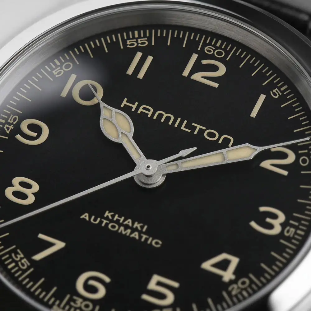 Typickým znakem Khaki Field hodinek je čistý číselník s výraznými arabskými číslicemi, 24hodinovou stupnicí a luminiscenčními ručkami. Nabízejí se v různých velikostech a provedeních – od mechanických modelů s ručním nátahem, přes automatické verze, až po quartzové varianty. Pouzdra jsou často z oceli s matnou úpravou, doplněná textilními, koženými nebo ocelovými náramky, odolnými proti každodennímu opotřebení.