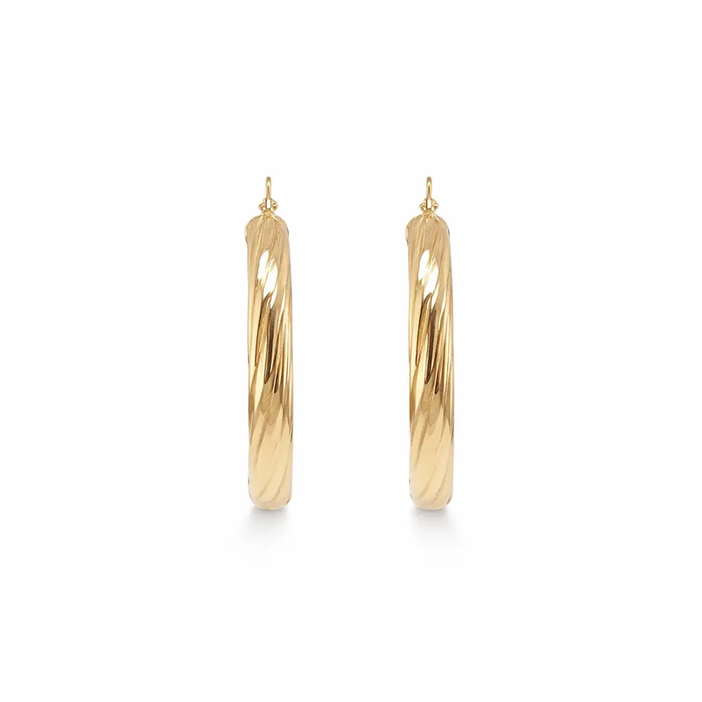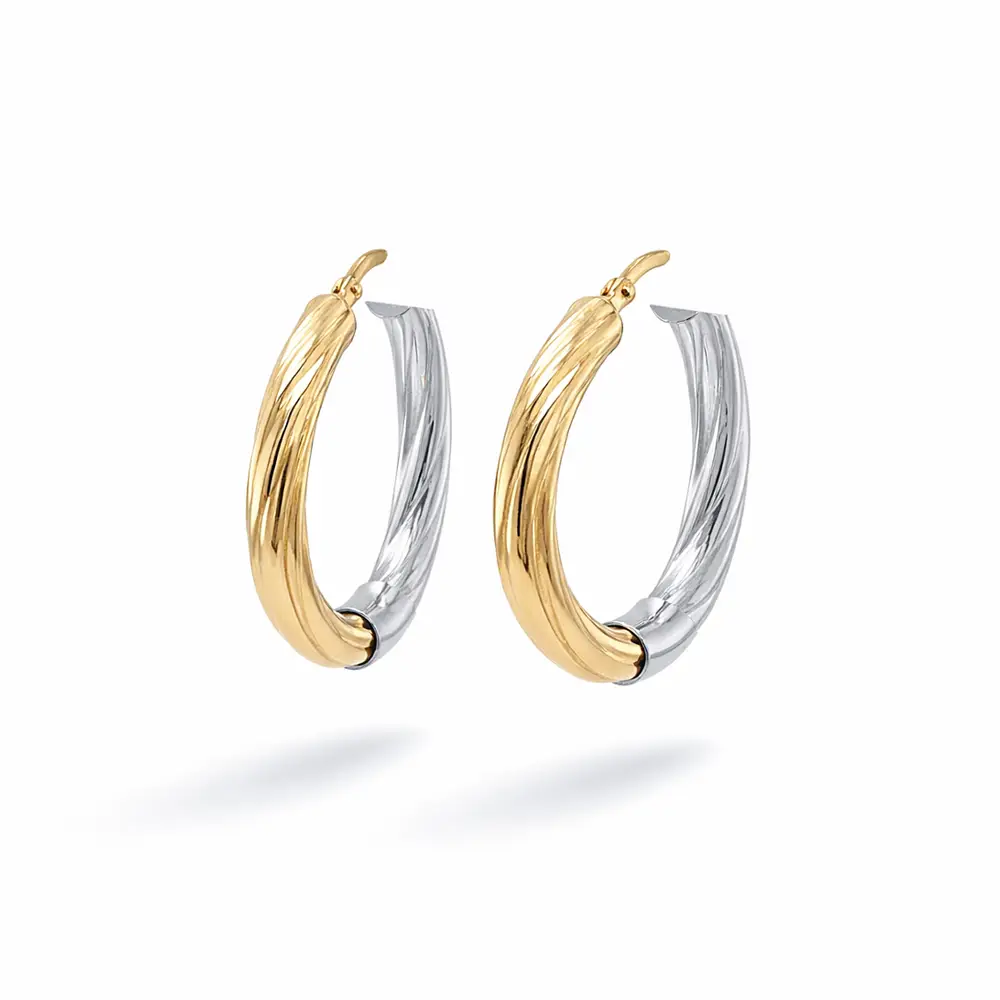 Tyto kruhové náušnice z dvoubarevného zlata zaujmou elegantním kontrastem žlutého a bílého zlata, který vytváří nadčasový a zároveň výrazný vzhled. Jemně tvarovaný povrch odráží světlo a dodává šperku sofistikovaný lesk, vhodný pro každodenní nošení i slavnostnější příležitosti.