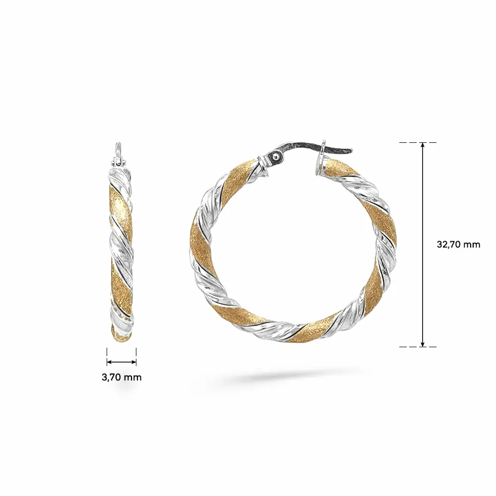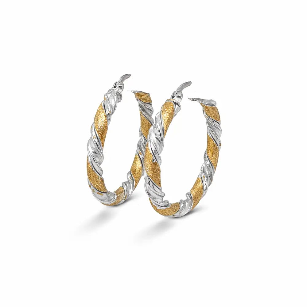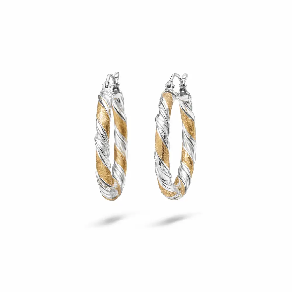 Tyto kruhové náušnice z dvoubarevného zlata zaujmou elegantním spirálovým designem, který kombinuje hladce leštěné bílé zlato s jemně strukturovaným žlutým zlatem. Kontrast povrchů vytváří moderní, ale nadčasový vzhled, který krásně odráží světlo a dodává šperku výrazný charakter.