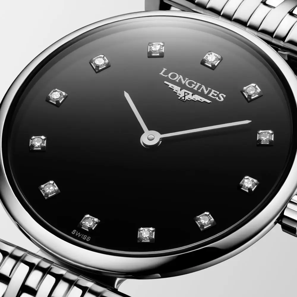 Na černém číselníku se vyjímají 12 diamantových indexů, které dodávají modelu luxusní charakter a zároveň podtrhují minimalistický vzhled. Jemné stříbrné ručky zajišťují čitelnost a vytvářejí kontrast k tmavému podkladu.