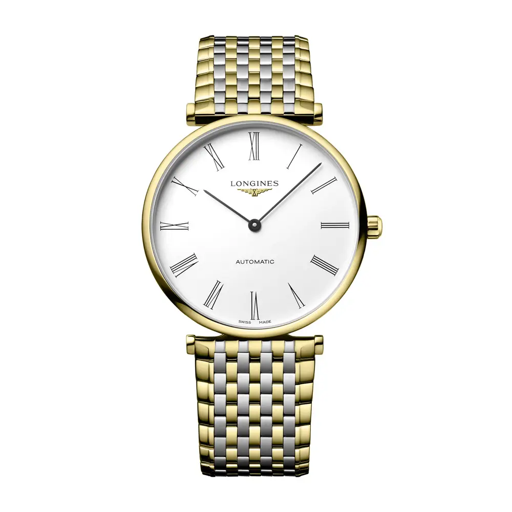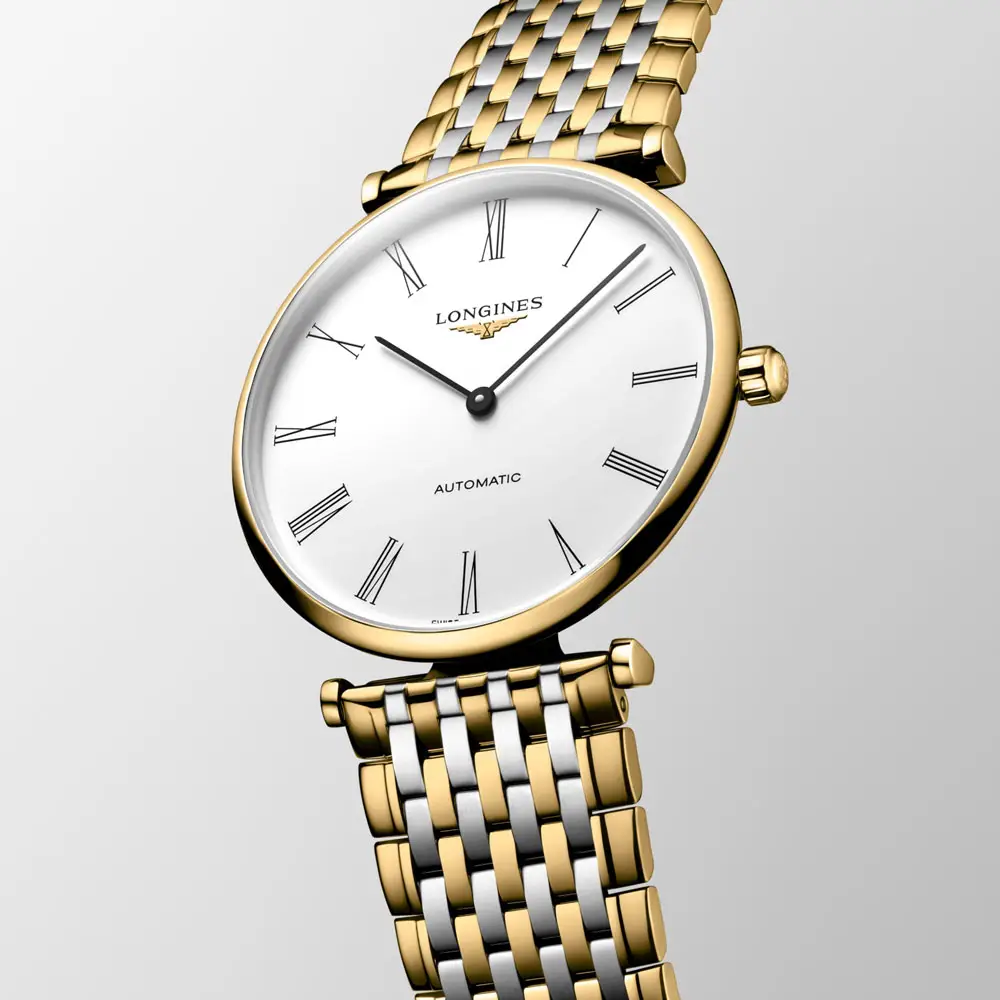 Uvnitř pracuje automatický kalibr L591 s rezervou chodu až 45 hodin, jenž garantuje přesnost a technickou spolehlivost. Hodinky doplňuje ocelovo-zlatý náramek se žlutým PVD povrchem a trojité bezpečnostní skládací zapínání, které spojuje komfort, eleganci a jistotu. Tento model je dokonalým vyjádřením hodnot Longines – tradice, kvality a nadčasové krásy.