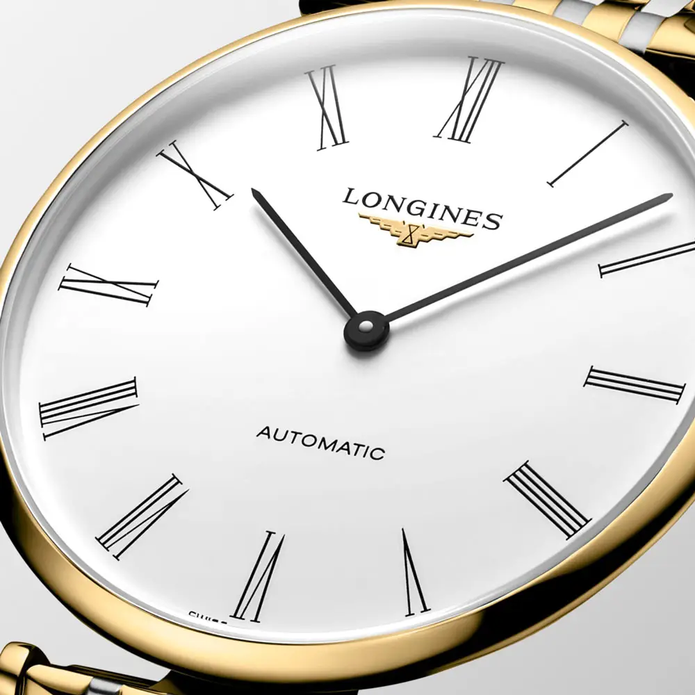 Čistý bílý ciferník s černými římskými číslicemi a jemnými ručkami podtrhuje nadčasový design kolekce La Grande Classique. Transparentní zadní víko umožňuje obdivovat precizně zdobený strojek, který odráží švýcarskou tradici značky Longines.
