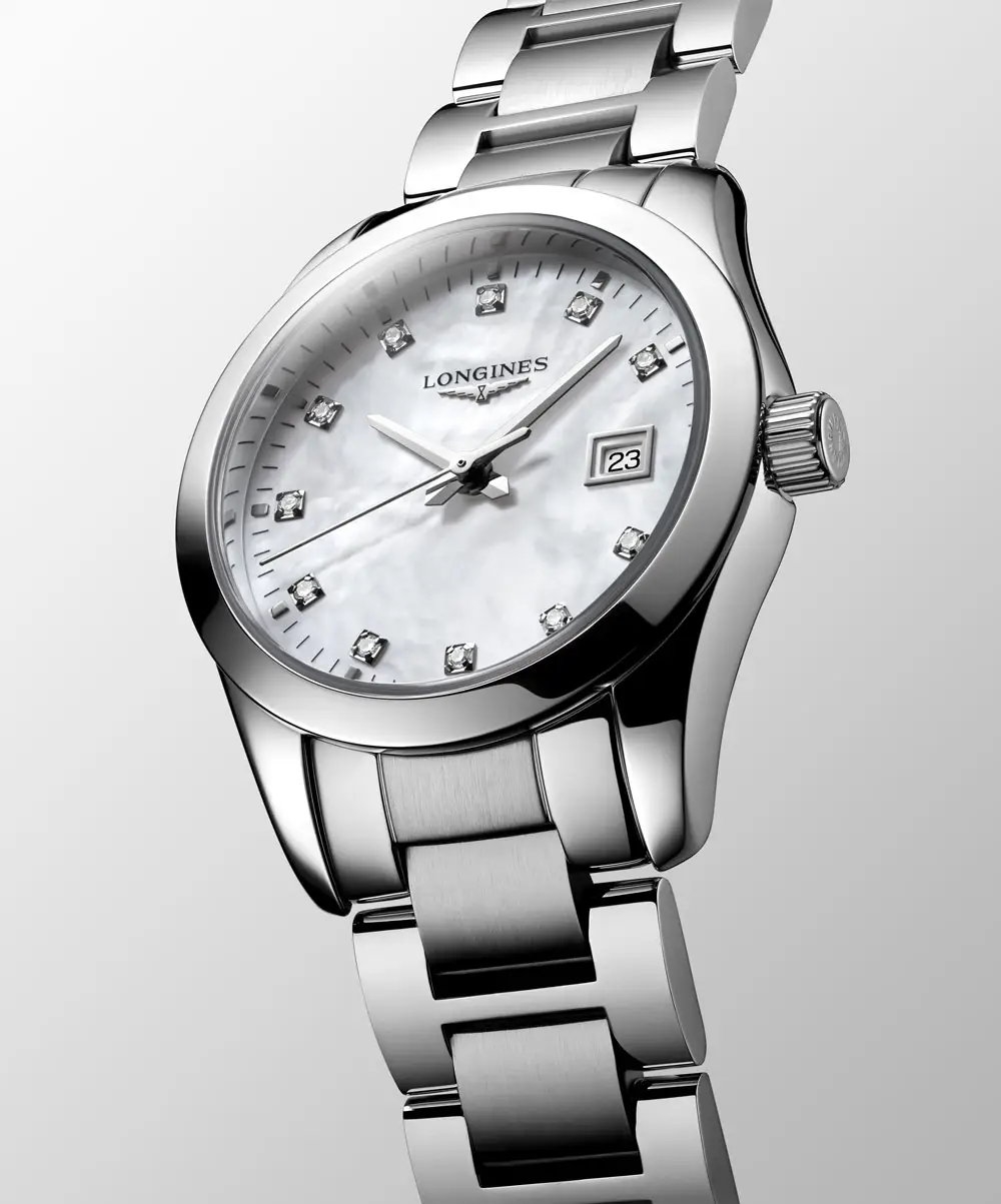 Longines Conquest Classic L2.286.4.87.6 je dámský model, který spojuje jemnou eleganci a šperkárské detaily s precizností švýcarského hodinářství. Pouzdro o průměru 29,5 mm z nerezové oceli rámuje perleťový ciferník osazený 11 diamantovými indexy, které dodávají hodinkám sofistikovaný lesk. Na pozici třetí hodiny se nachází praktické datumové okénko.