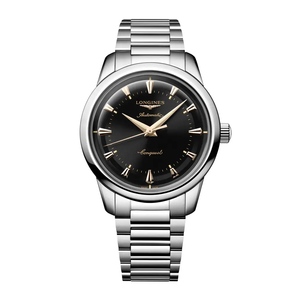 Longines Conquest Heritage L1.650.4.52.6 představují elegantní spojení tradiční hodinářské preciznosti a nadčasového designu inspirovaného historickými modely značky. Pouzdro o průměru 40 mm z nerezové oceli působí vyváženě a univerzálně, zatímco černý lakovaný ciferník s vysokým leskem dodává hodinkám sofistikovaný charakter vhodný jak pro formální, tak každodenní nošení.