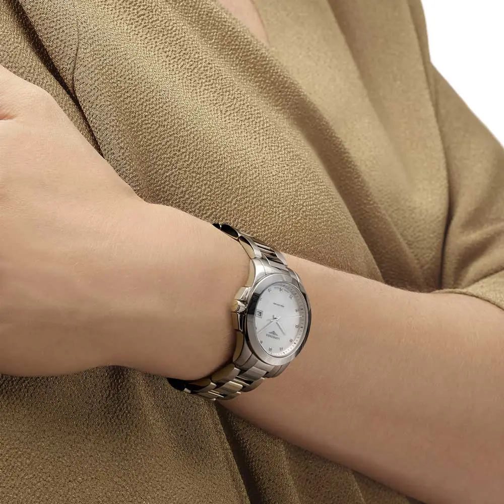 Na perleťovém ciferníku se vyjímají diamantové indexy, které dodávají luxusní třpyt a jedinečný charakter. Jemné stříbrné ručky s luminiscencí zajišťují dokonalou čitelnost i v horších světelných podmínkách, zatímco datumové okénko na pozici 3 hodin podtrhuje praktičnost modelu.