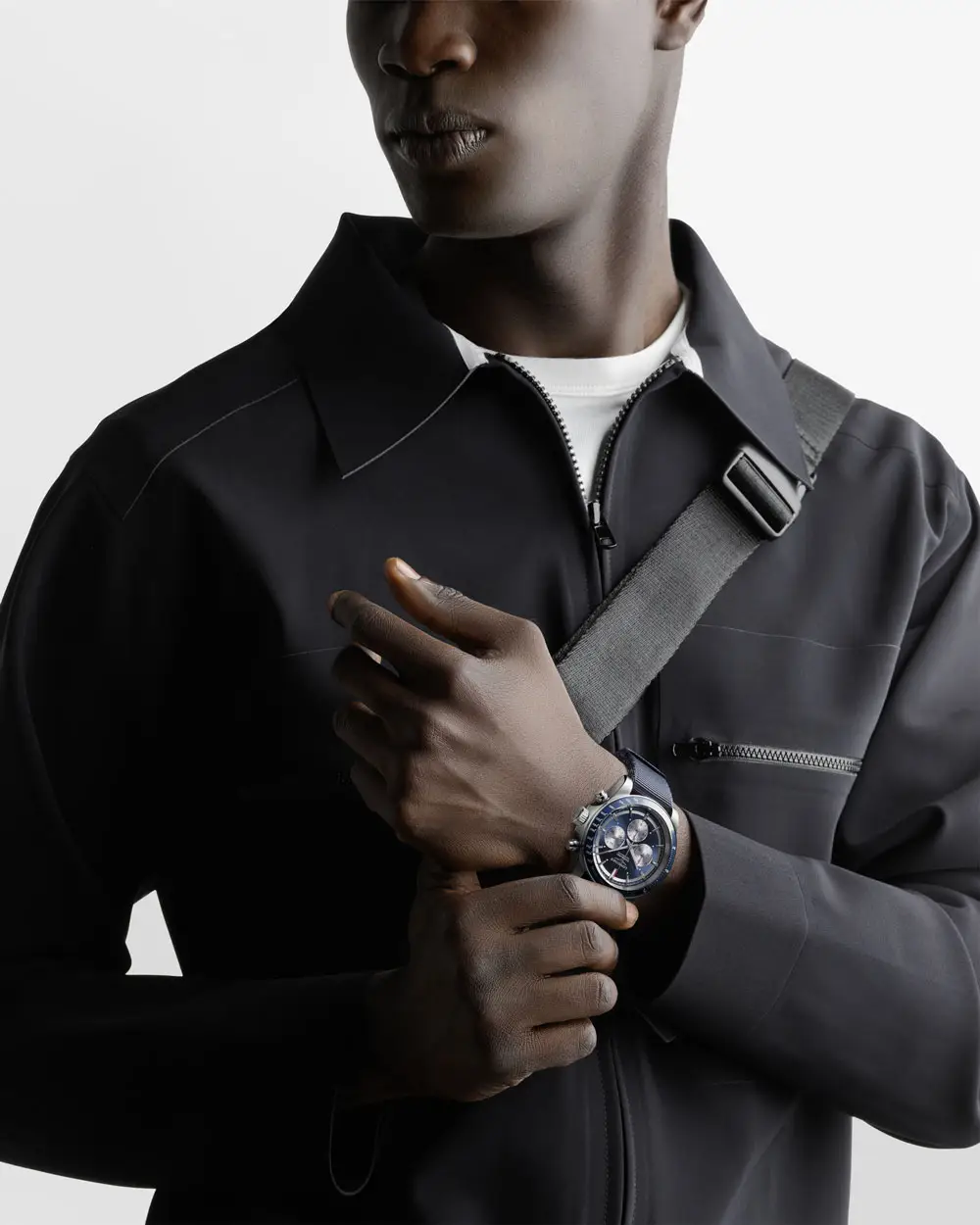 Modrý sunray ciferník zdobí subčíselníky chronografu, kontrastní luminiscenční ručky a indexy a také datumové okénko, které zvyšuje praktičnost modelu. Sportovní charakter je umocněn kombinací precizního zpracování a dynamického designu, inspirovaného světem vrcholového lyžování.