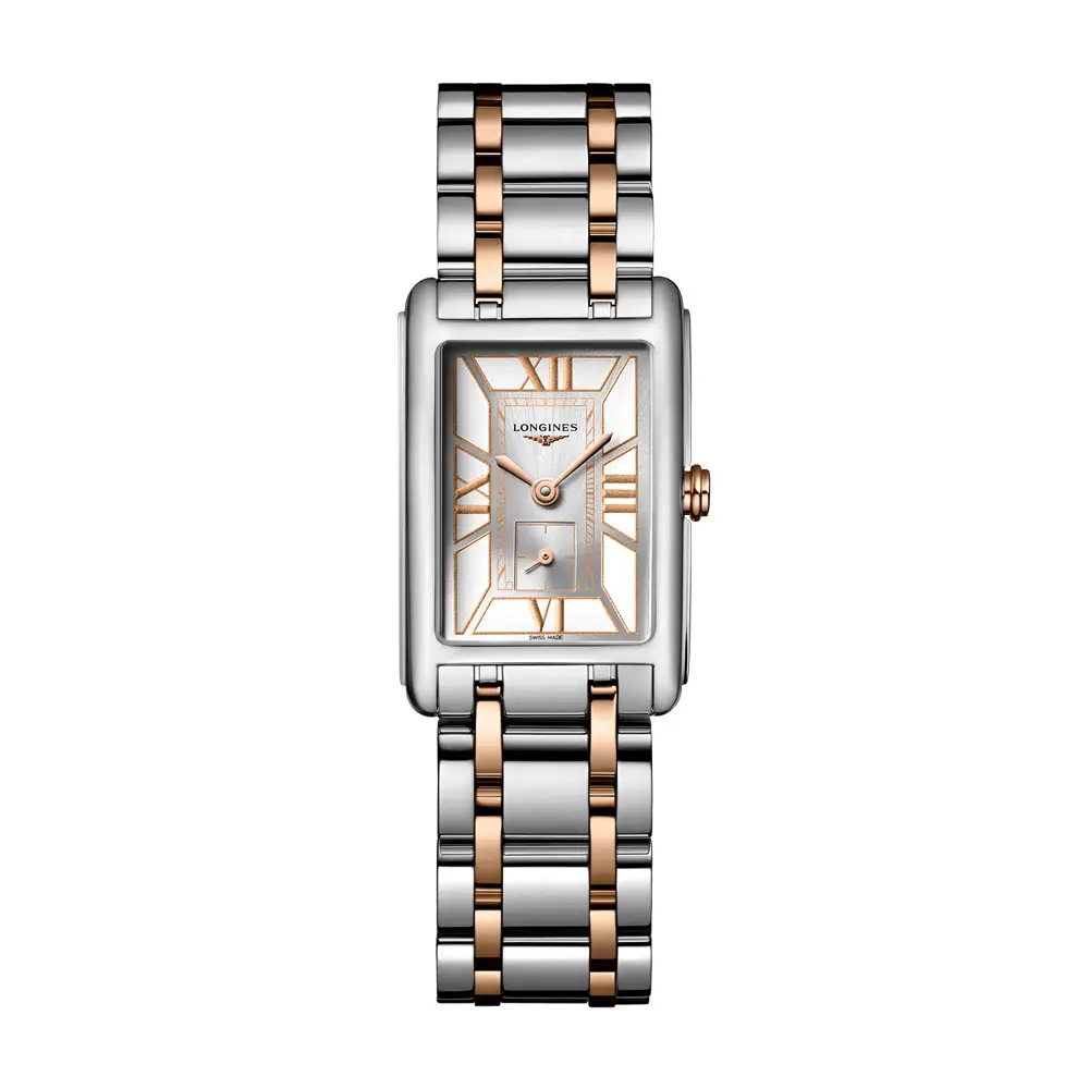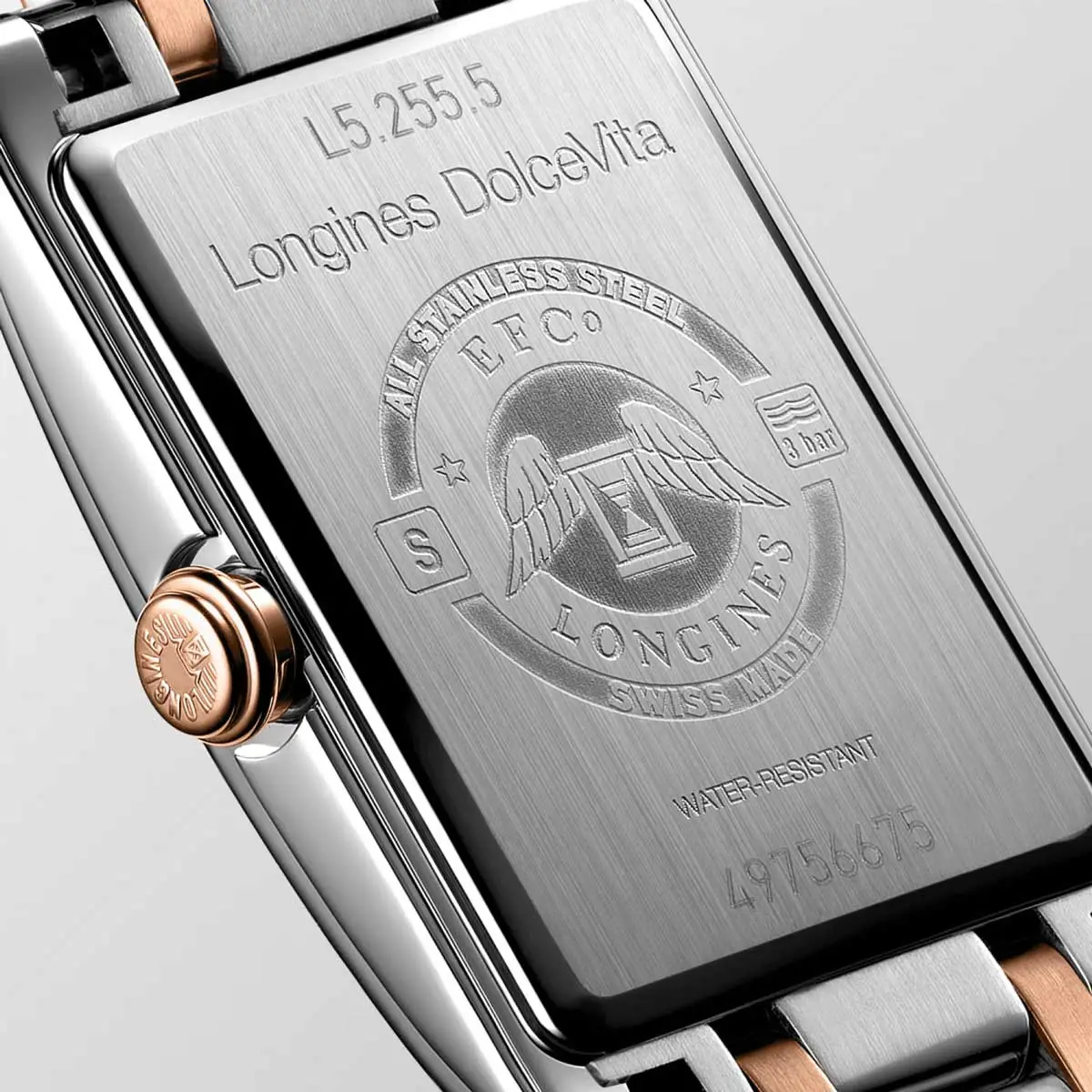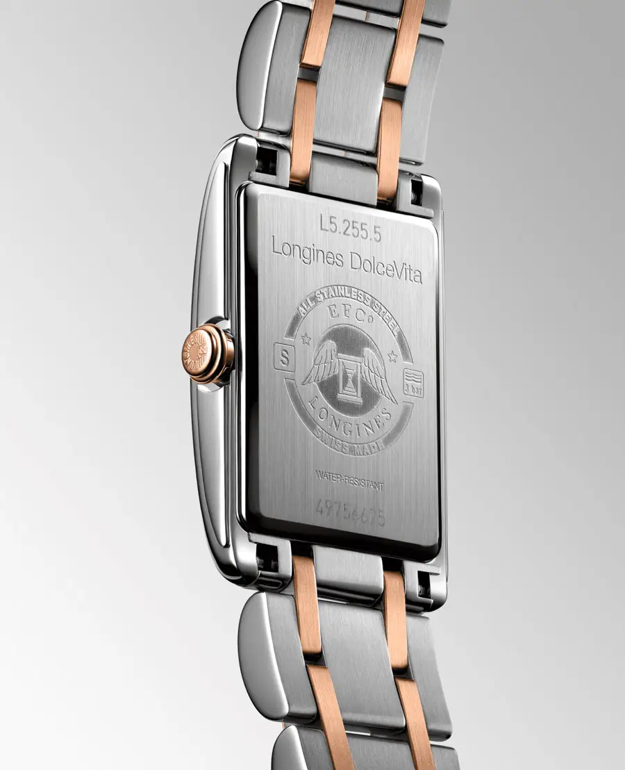 Longines DolceVita L5.255.5.75.7 je dámský model v kompaktním provedení, který spojuje eleganci kolekce DolceVita s jemným dvoubarevným stylem. Pouzdro z nerezové oceli o velikosti 20,80 × 32,00 mm doplňuje korunka z 18kt růžového zlata, zatímco stříbrný ciferník s „flinqué“ vzorem, římskými číslicemi a modře tónovanými ručkami odráží klasický charakter hodinek.