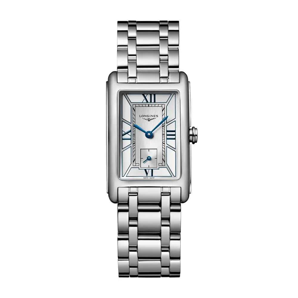 Longines DolceVita L5.512.4.75.6 je dámský model, který spojuje nadčasovou estetiku a jemný charakter kolekce DolceVita. Pouzdro z nerezové oceli o rozměrech 23,30 × 37,00 mm obklopuje bílý ciferník s římskými číslicemi, modře tónovanými ručkami a malou vteřinovou ručkou na pozici 6 hodin. Výsledkem je elegantní design inspirovaný klasickými tvary.