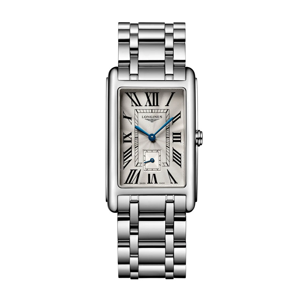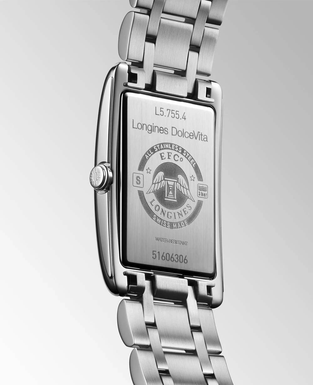 Longines DolceVita L5.755.4.71.6 je elegantní dámské hodinky střední velikosti, které v sobě spojují klasický obdélníkový design a nadčasovou eleganci. Pouzdro z nerezové oceli o rozměru 26,1 × 42,0 mm obklopuje stříbrný ciferník s jemným „flinqué“ vzorem, římskými číslicemi a modře tónovanými ručkami, jež dodávají modelu sofistikovaný charakter.