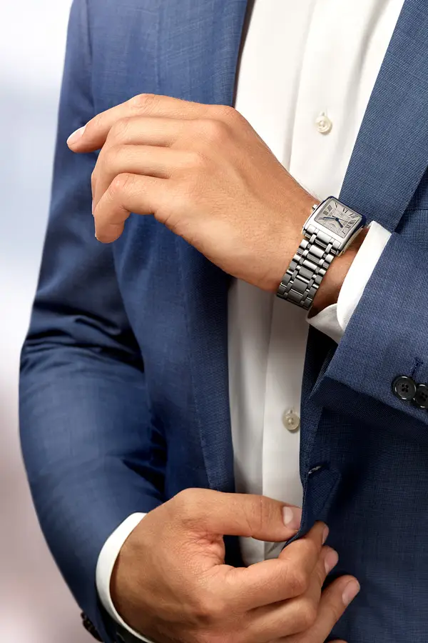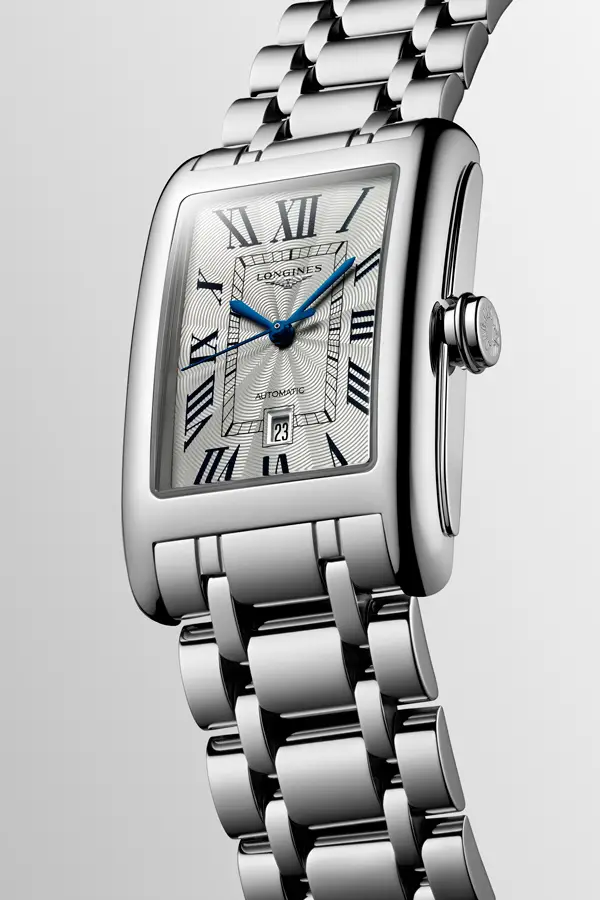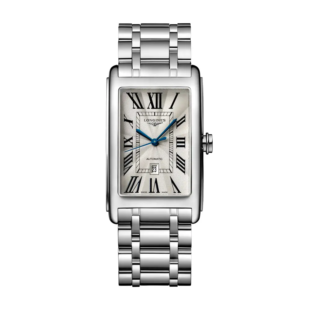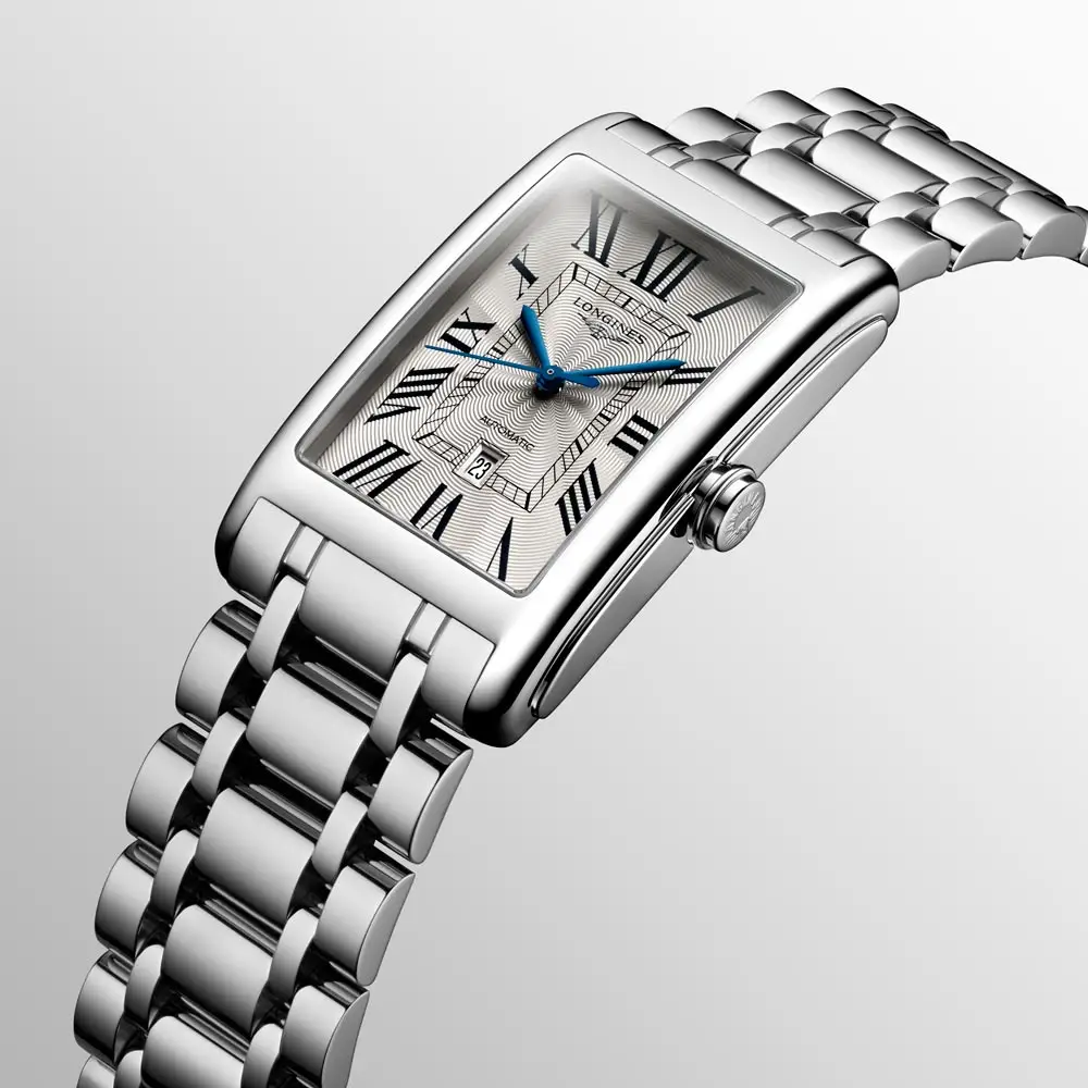 Longines DolceVita L5.767.4.71.6 je pánský model, který spojuje klasický obdélníkový design s moderním mechanickým strojkem. Pouzdro z nerezové oceli o rozměru 28,20 × 47,00 mm rámuje stříbrný ciferník s jemným „flinqué“ vzorem, římskými číslicemi a modře tónovanými ručkami, jež podtrhují nadčasovou estetiku kolekce DolceVita.