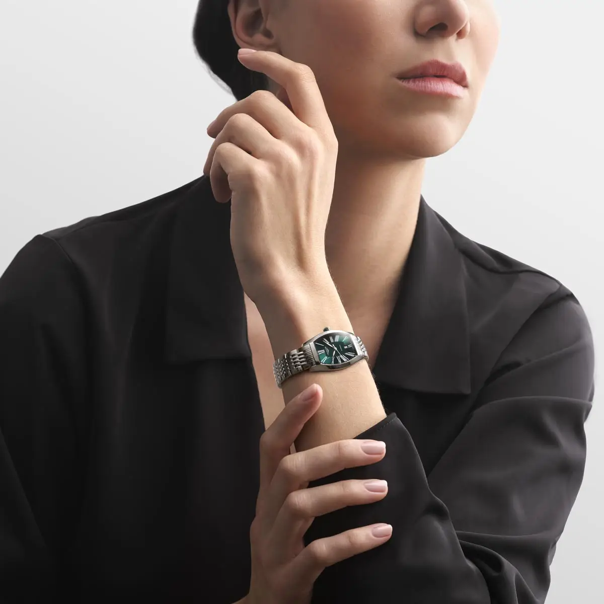 Na čele hodinek se vyjímá sofistikovaný zelený analogový ciferník, který dodává modelu osobitý charakter a je doplněn praktickou datumovkou. Celý ciferník chrání odolné safírové sklo, které zaručuje dlouhou životnost a výbornou čitelnost.