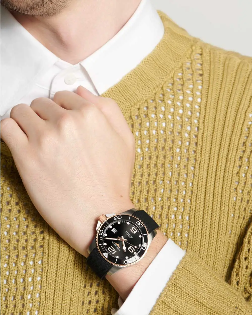 Černý kaučukový pásek se skládací sponou poskytuje pohodlí a výborné přizpůsobení zápěstí. Tento elegantní a zároveň robustní model je perfektní volbou pro muže, kteří chtějí kombinovat sportovní funkce s výrazným stylovým vzhledem.