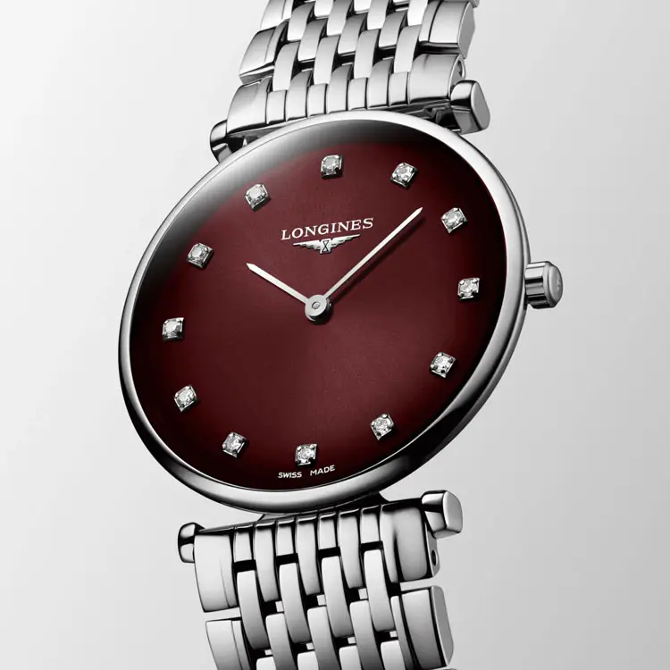 La Grande Classique de Longines L4.512.4.91.6 je ideální volbou pro ženy, které hledají jemný, výrazný a zároveň luxusní doplněk, který vyniká díky diamantům, stylovému bordó ciferníku a prvotřídnímu zpracování.