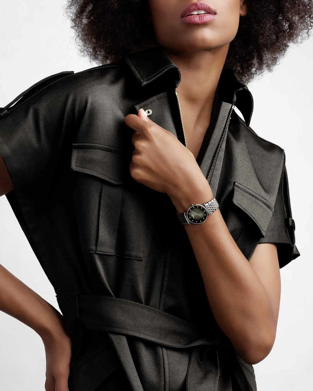 Číselník v hlubokém zeleném odstínu je ozdoben 12 diamantovými indexy (0,081 ct), které vytvářejí harmonický kontrast a dodávají hodinkám luxusní lesk. Minimalistické ručky v leštěném provedení podtrhují nadčasový charakter a činí z modelu ideální doplněk pro výjimečné příležitosti i každodenní eleganci.
