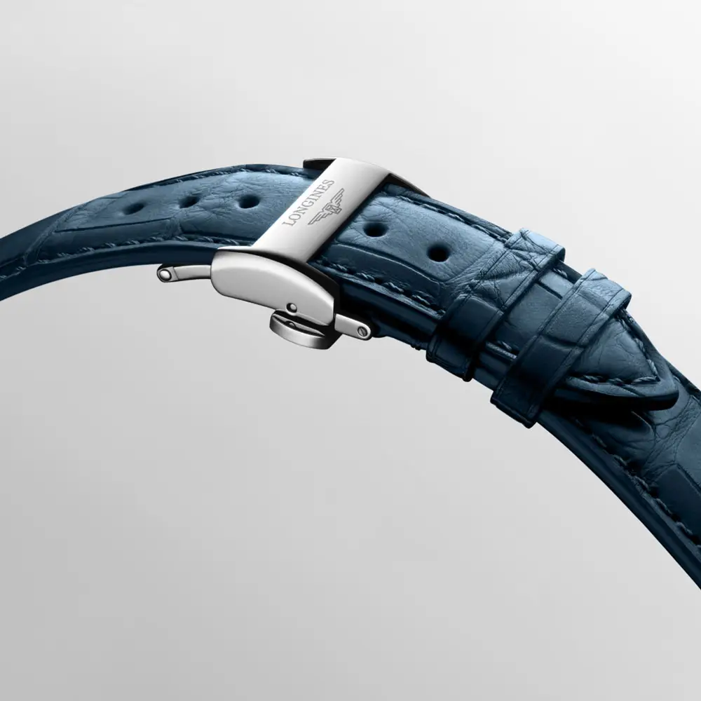 Doplněny jsou elegantním modrým řemínkem z pravé aligátoří kůže s překlápěcí sponou, který podtrhuje estetiku celé kompozice. Díky vodotěsnosti do 30 metrů (3 ATM) jsou hodinky vhodné pro běžné denní nošení.