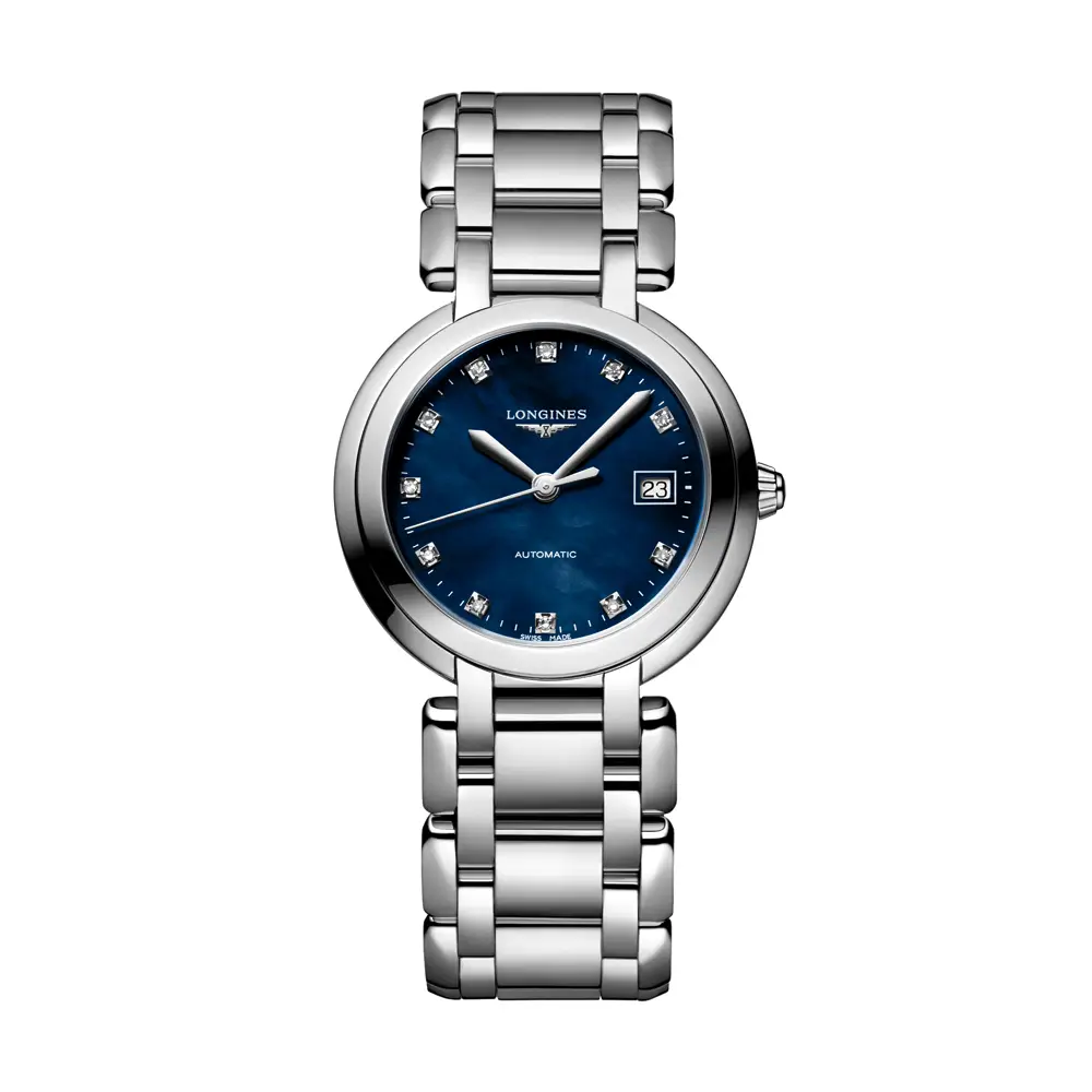 Longines PrimaLuna L8.113.4.98.6 představuje harmonické spojení ženské elegance, jemné estetiky a švýcarské preciznosti. Tento model z oblíbené kolekce PrimaLuna zaujme svým ocelovým pouzdrem o průměru 30 mm, které obklopuje nádherný ciferník z modré perleti zdobený 11 diamantovými indexy o celkové hmotnosti 0,044 ct. Celek chrání safírové sklíčko s antireflexní vrstvou, které zaručuje odolnost a dokonalou čitelnost.