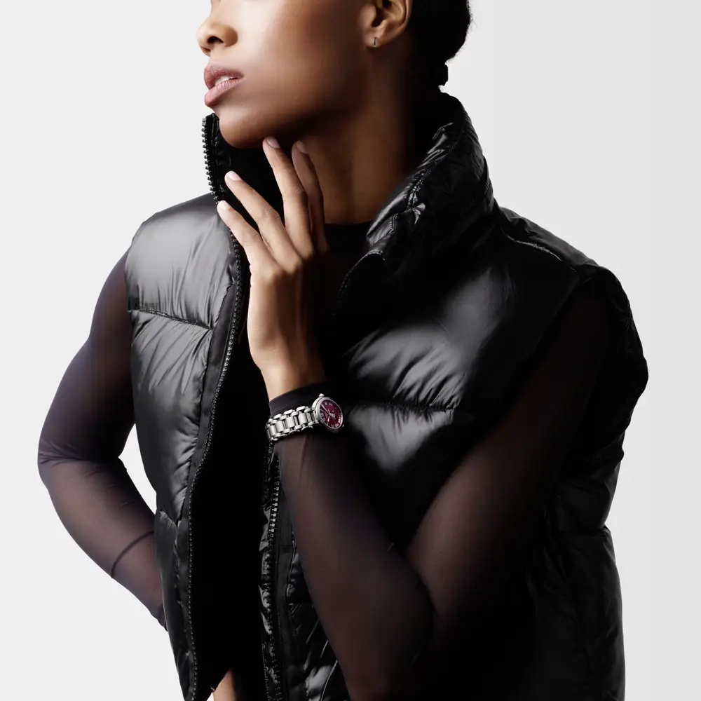 Ciferník modelu zaujme hlubokou bordó (červenou) barvou s efektem slunečního brusu, která dodává modelu ženský a sofistikovaný charakter. Mezi praktické funkce patří měsíční fáze a datum, které doplňují základní zobrazení času a přidávají hodinkám výraznou eleganci. Díky voděodolnosti 3 bar (30 m) jsou vhodné pro běžné denní situace.