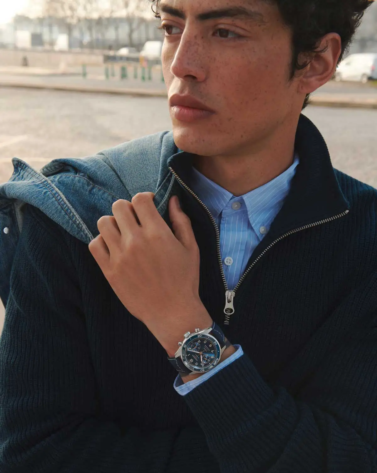 Kulaté pouzdro o průměru 42 mm je vyrobeno z ušlechtilé oceli a osazeno odolnou keramickou lunetou, která zajišťuje ochranu proti poškrábání a podtrhuje sportovní charakter hodinek. Modrý ciferník s výraznými indexy, luminiscenčními ručkami a chronografem s funkcí flyback je skvěle čitelný za všech podmínek. Praktická datumovka je umístěna mezi čtvrtou a pátou hodinou. Vše je chráněno safírovým sklíčkem s antireflexní úpravou.