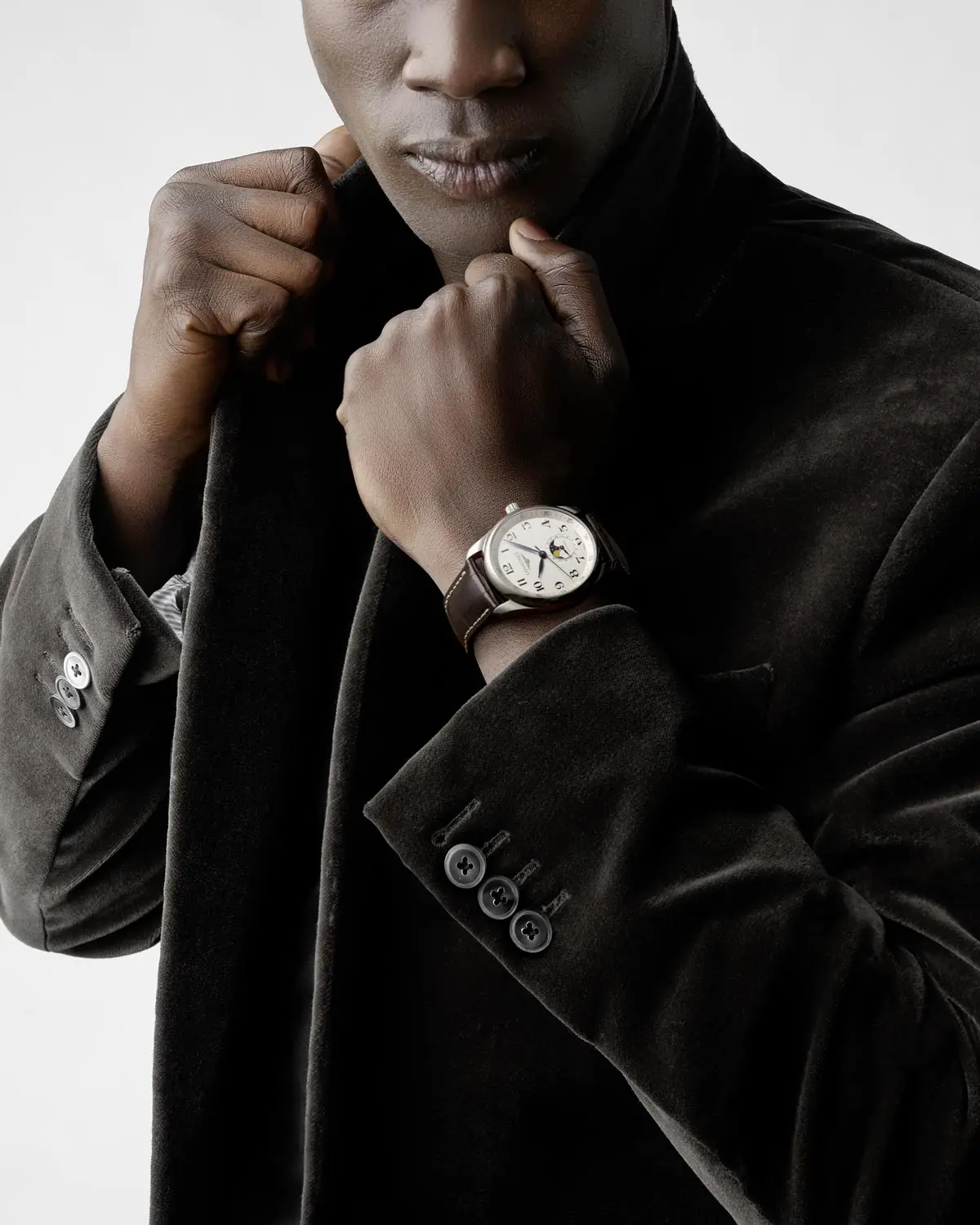 Na stříbrném „barleycorn“ číselníku vynikají arabské číslice a modřené ručky, které dodávají hodinkám vyvážený kontrast. Subciferník na pozici 6 hodin kombinuje indikaci fází měsíce s funkcí data, čímž model získává na praktičnosti i vizuální hloubce.